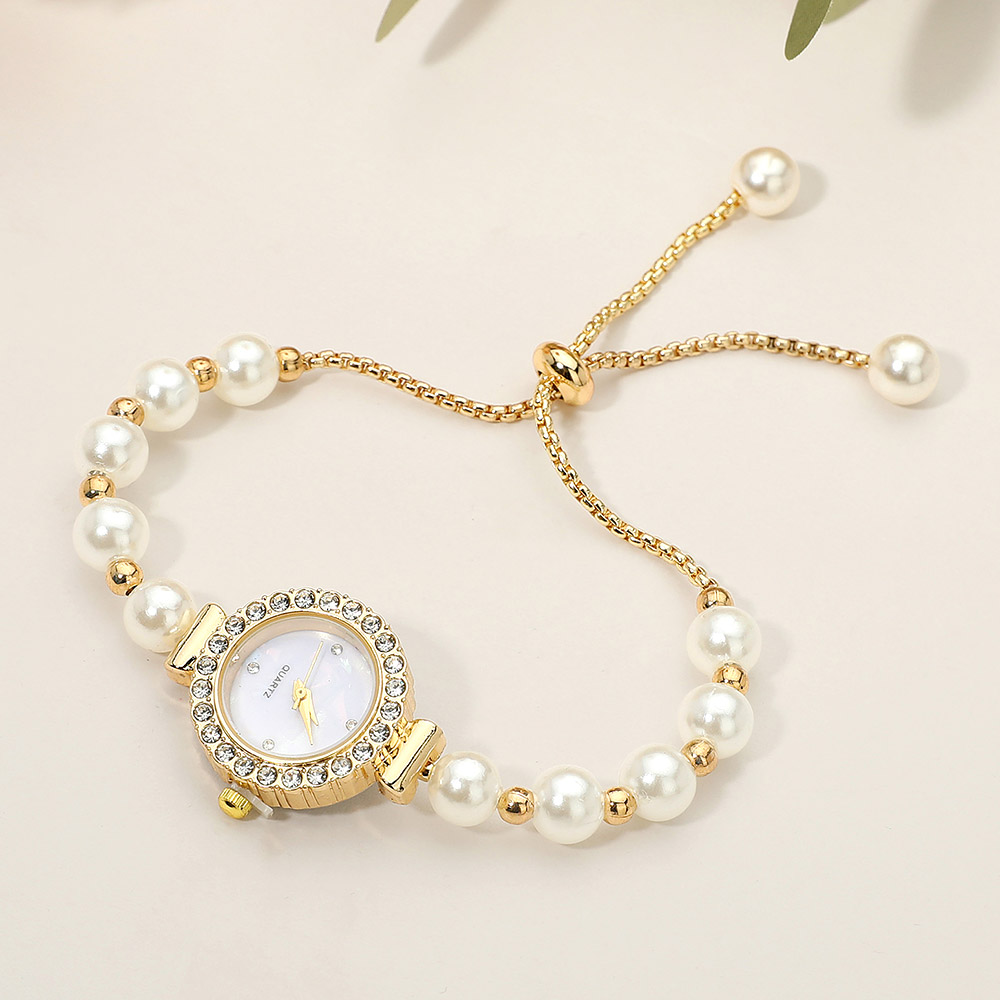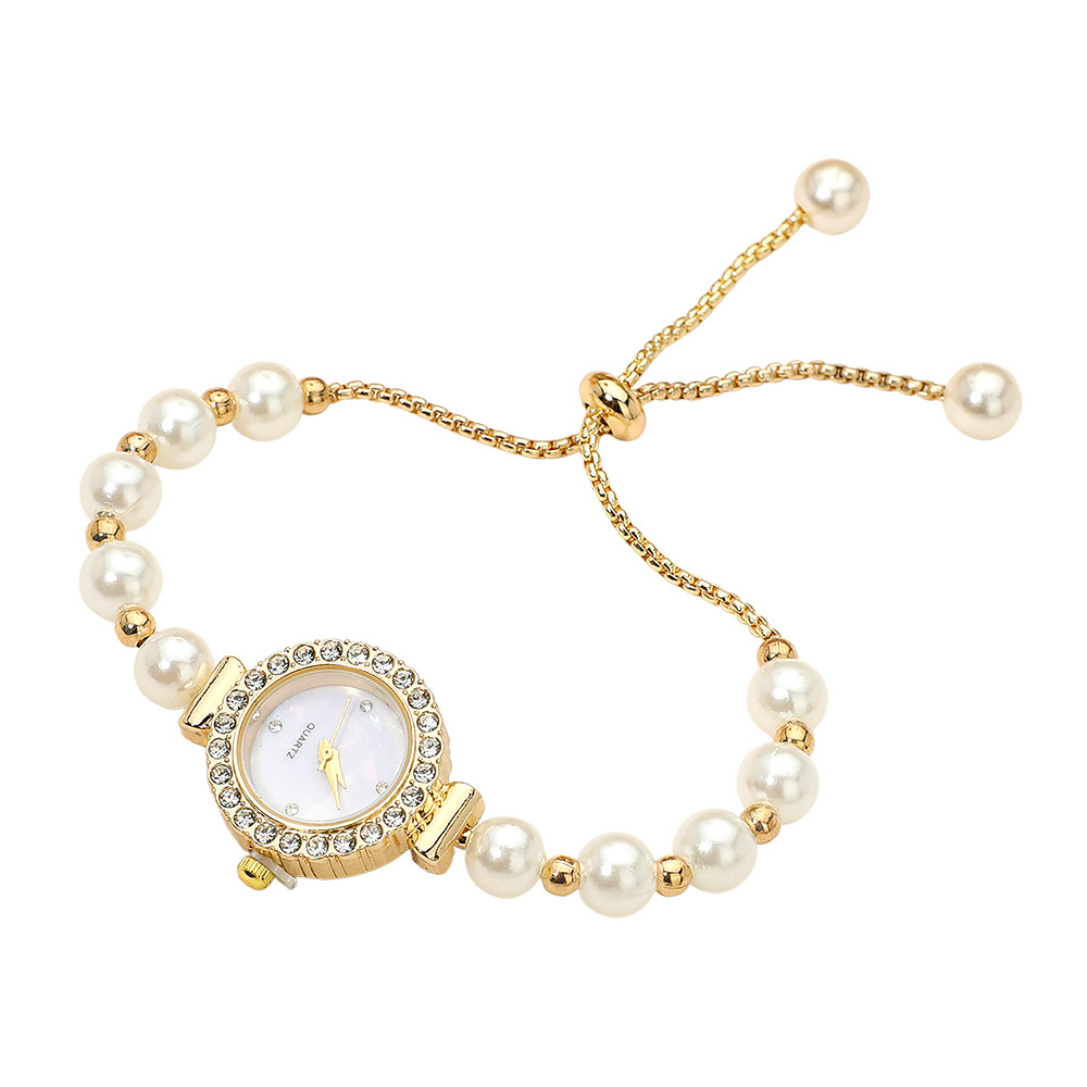 Details • Size : 0.9" H, 10" L • Adjustable • Delicate and versatile, this adjustable quartz watch features a pearl-accented strap with a sliding closure for a perfect fit. Its crystal-lined bezel and refined round dial bring timeless charm, making it an elegant accessory for both casual wear and formal occasions. • Stainless Steel