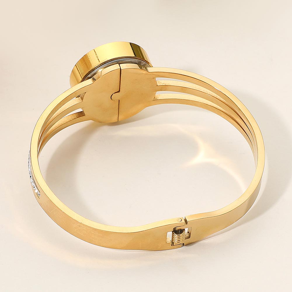 Details • Size : 0.9" H, 2.4" D • Hinged Closure • Water Resistant • Add timeless sophistication to your look with this elegant bangle-style quartz watch. Featuring a slim triple-band bracelet and a crystal-accented bezel, this chic timepiece perfectly balances fashion and function, making it an ideal accessory for any occasion. • Hypoallergenic • Stainless Steel