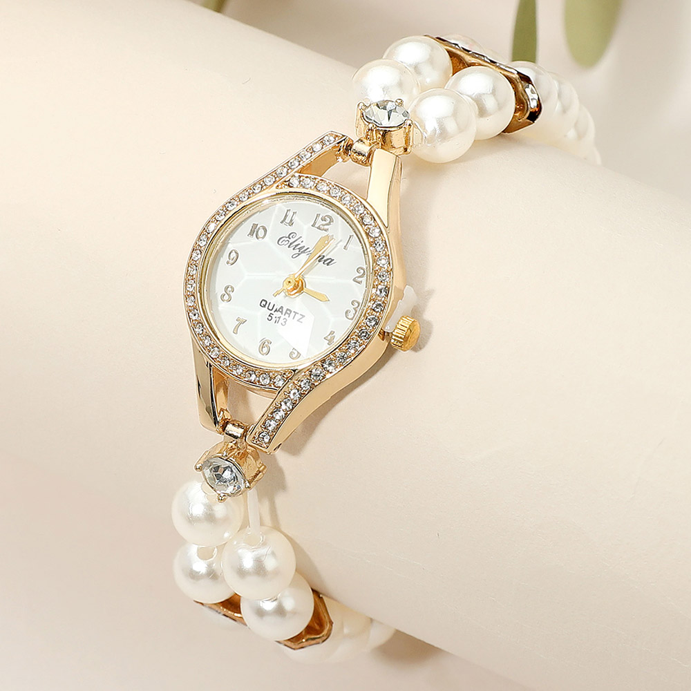 Details • Size : 0.9" H • Stretchable • Add timeless elegance to your look with this pearl strap quartz watch, highlighted by a crystal-accented bezel. Designed with a bracelet-style band, it offers a graceful blend of luxury and functionality, making it ideal for formal occasions or daily wear. • Stainless Steel