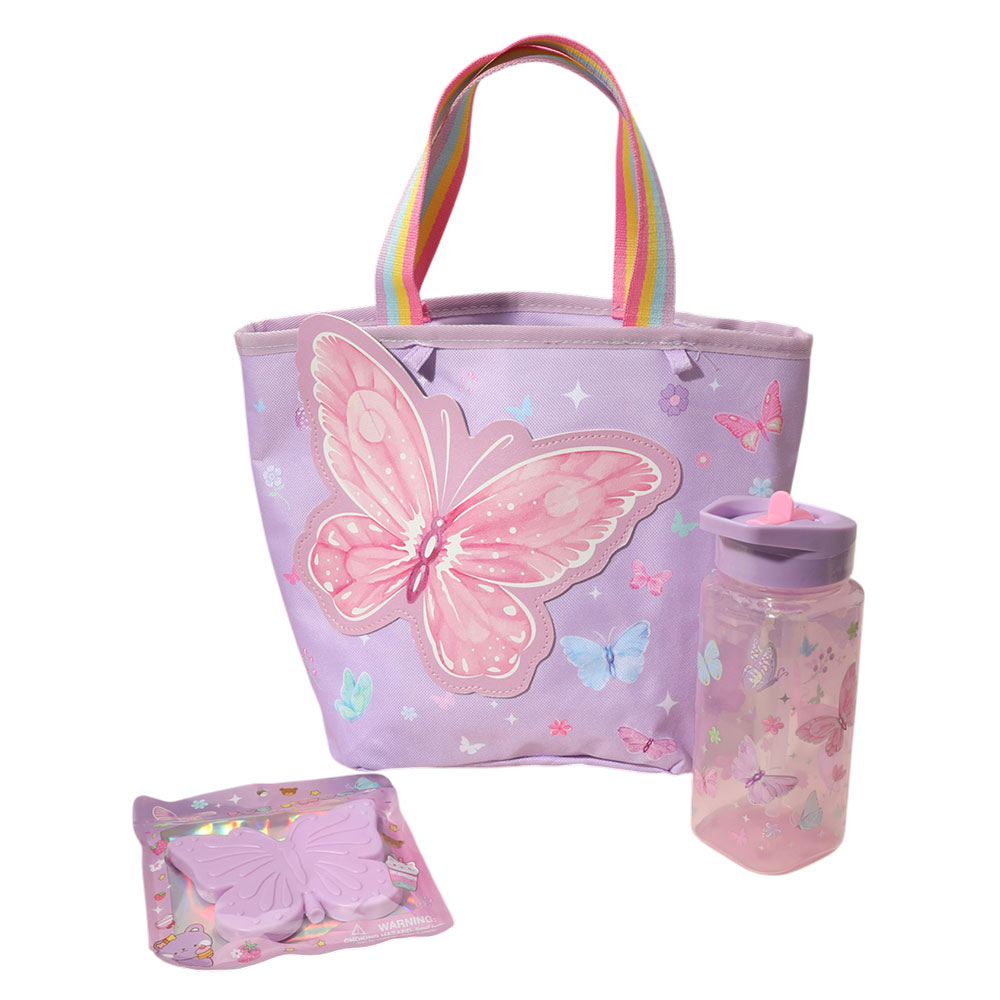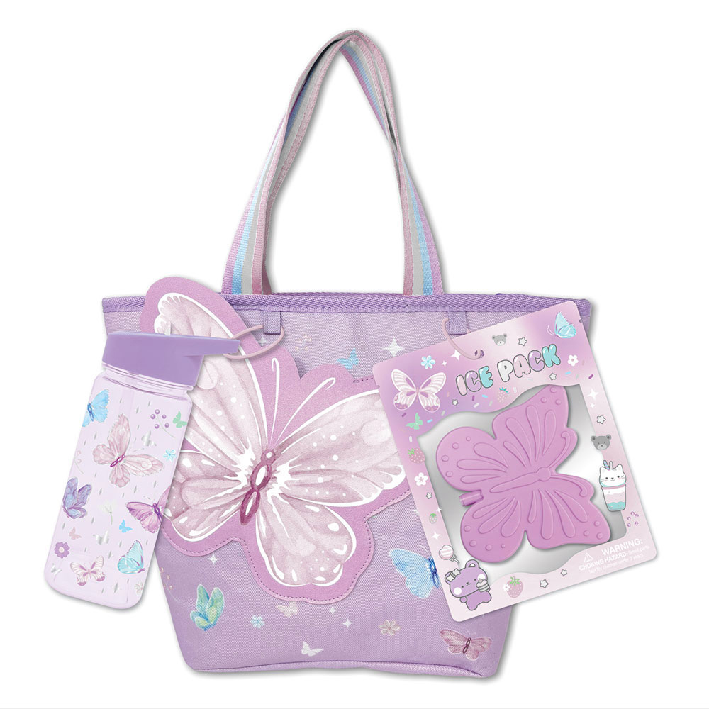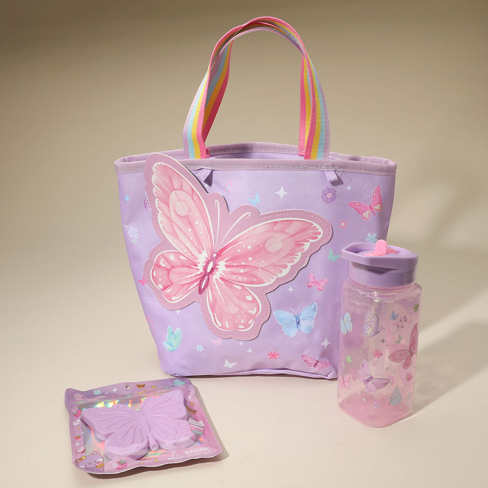 Details • Bag Size : 12" X 10" X 4.25" • Top Handle Size : 6" L • Zipper Closure • Tumbler Size : 3.8" X 5" • Ice Pack Size : 2.4" X 7" • 1 insulated bag, 1 ice pack and 1 water bottle included • Charming 3-piece kids tote set with butterfly design, matching water bottle, and reusable butterfly-shaped ice pack. Perfect for school, lunch, or day trips. Features rainbow handles and lightweight design.