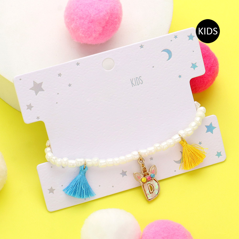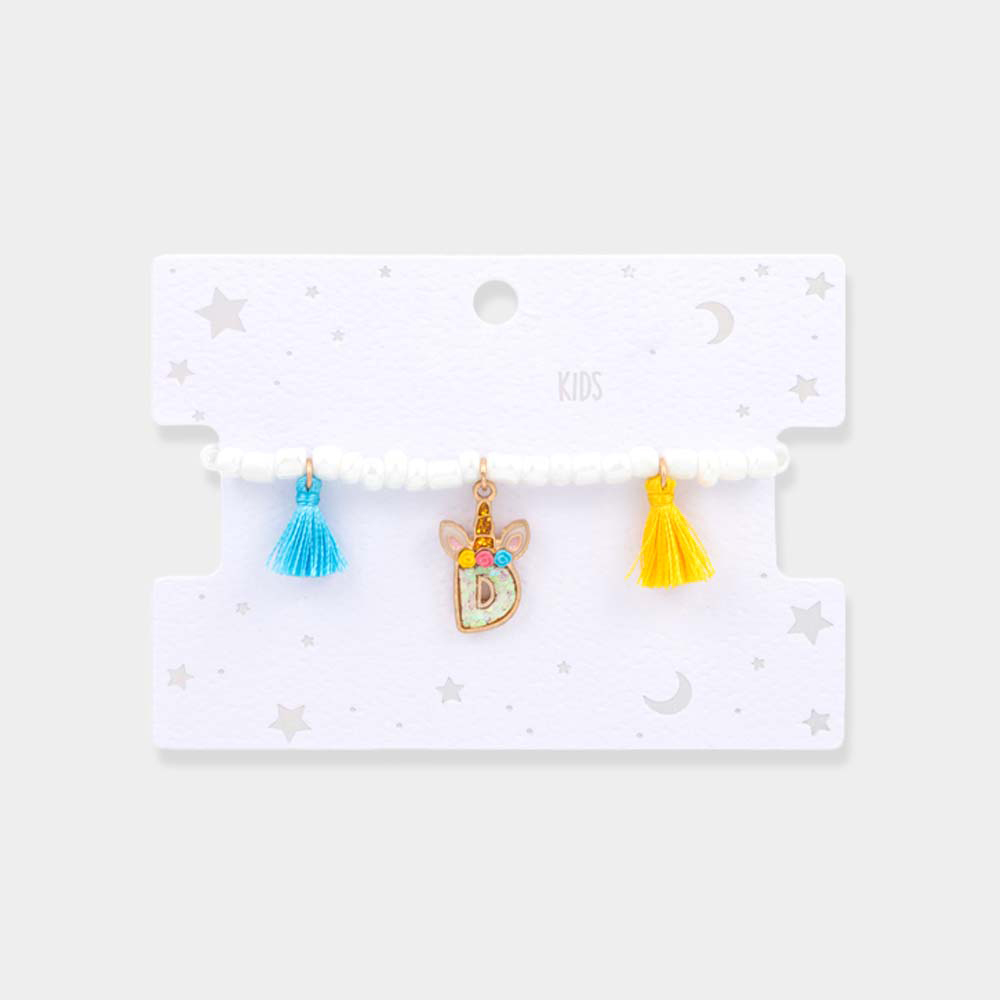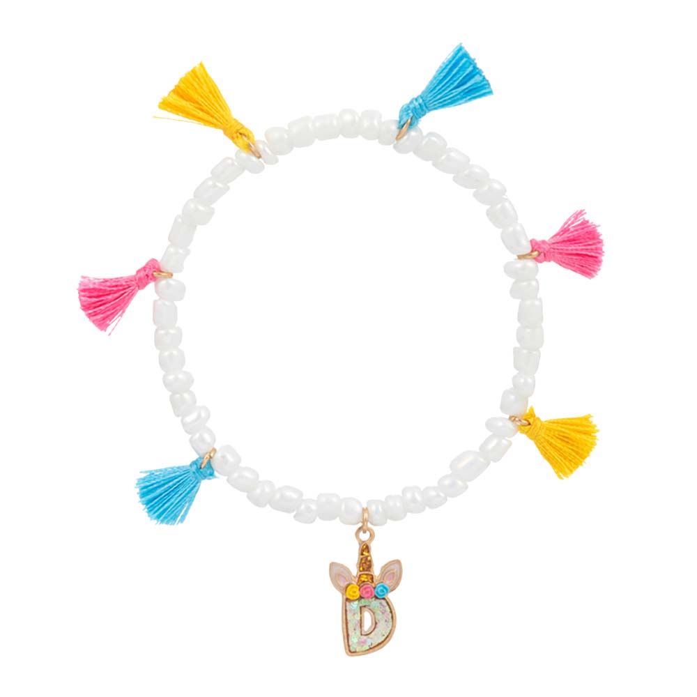 -D- Unicorn Initial Monogram Tassel Station Kids Beaded Stretch Bracelet