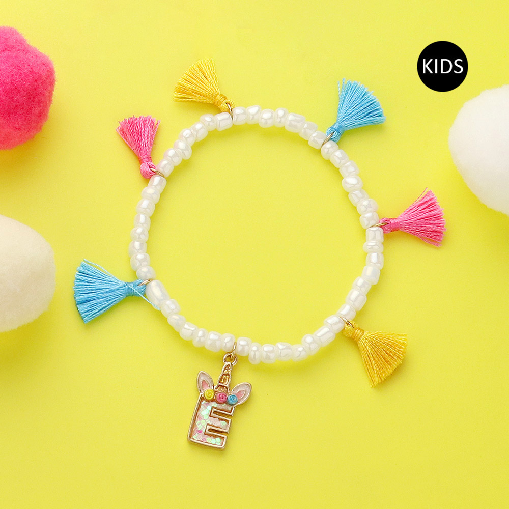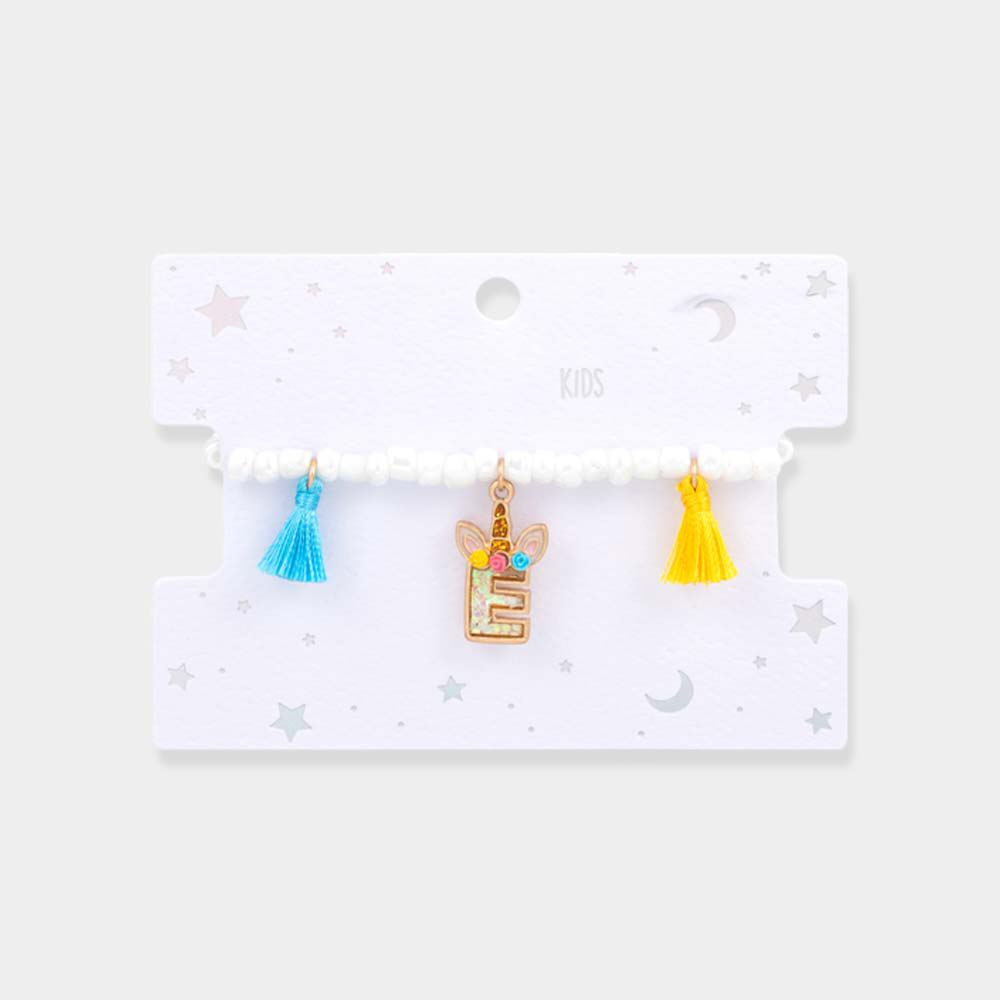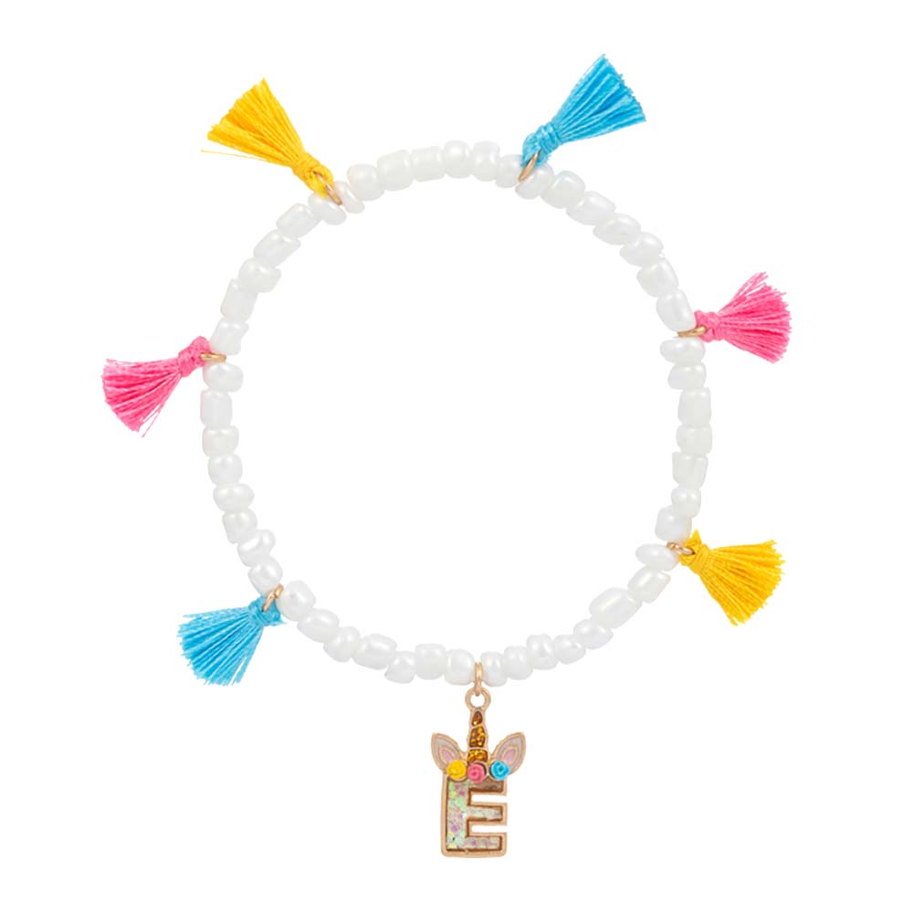 -E- Unicorn Initial Monogram Tassel Station Kids Beaded Stretch Bracelet