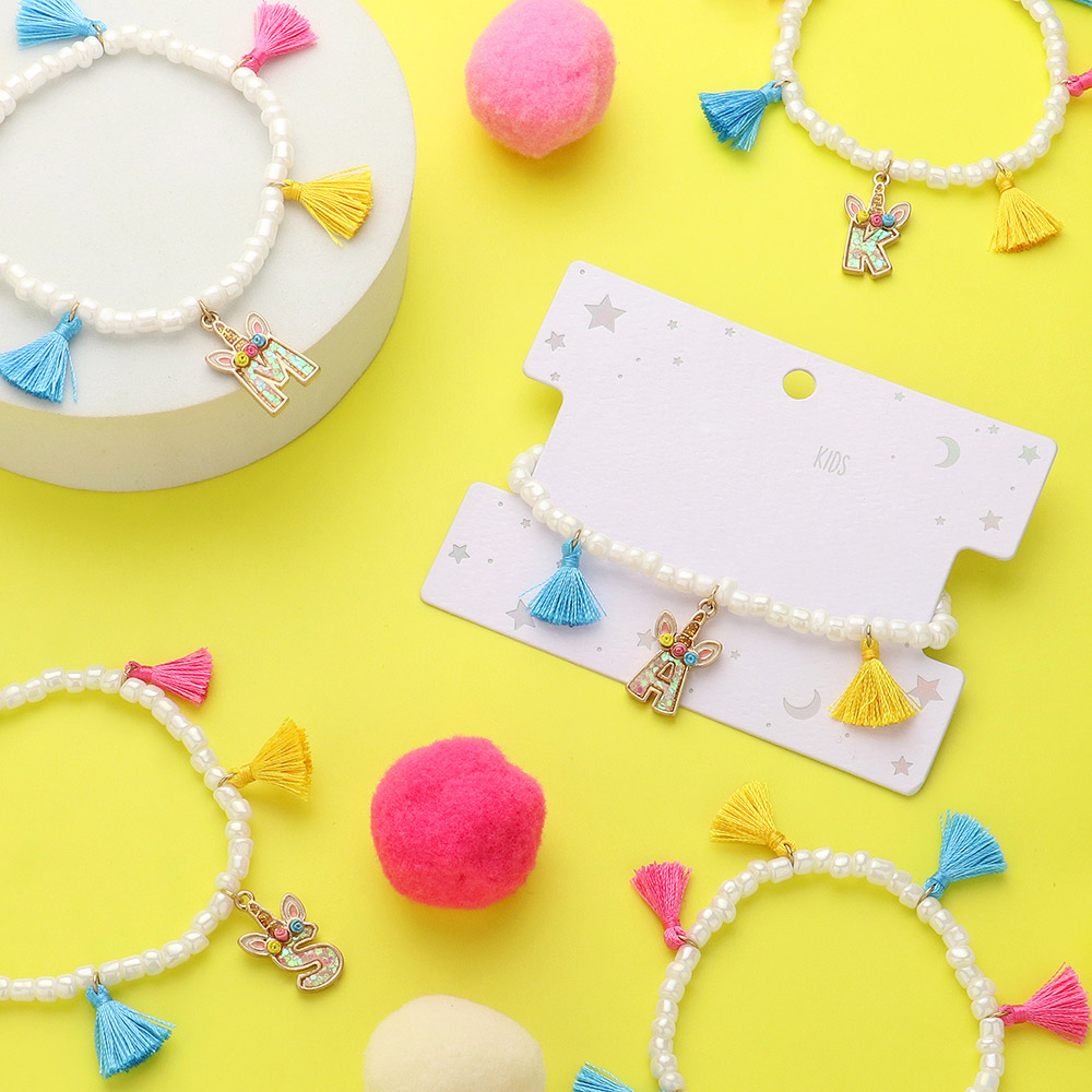 -K- Unicorn Initial Monogram Tassel Station Kids Beaded Stretch Bracelet