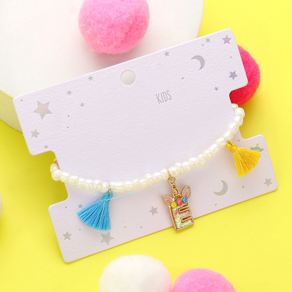 -N- Unicorn Initial Monogram Tassel Station Kids Beaded Stretch Bracelet