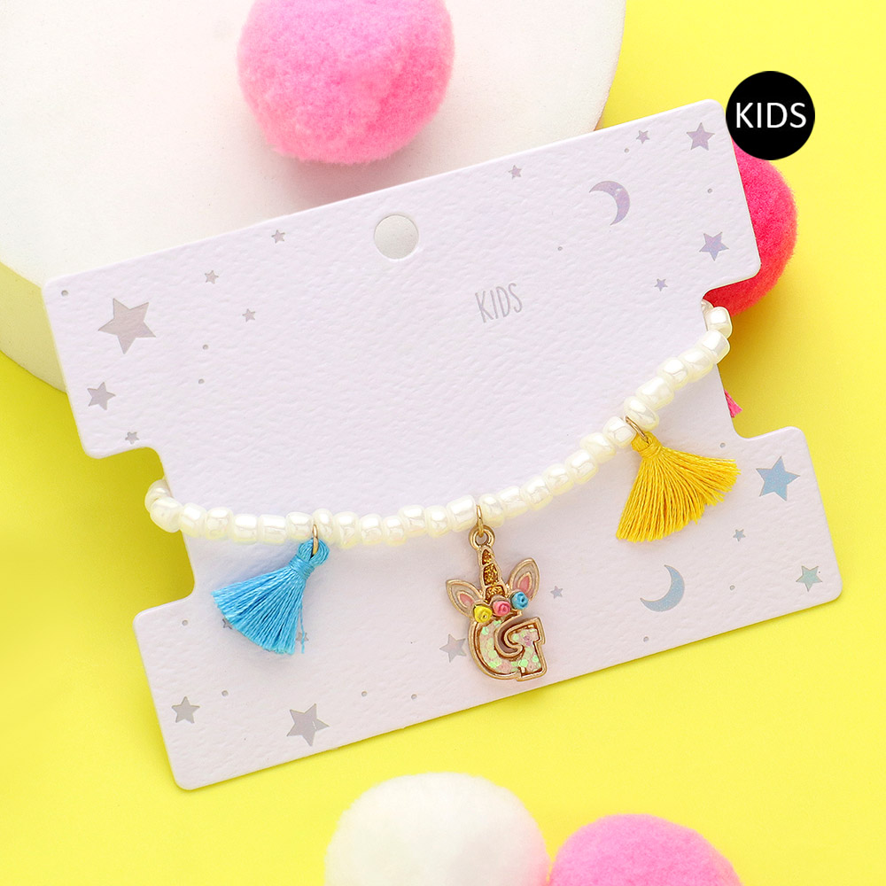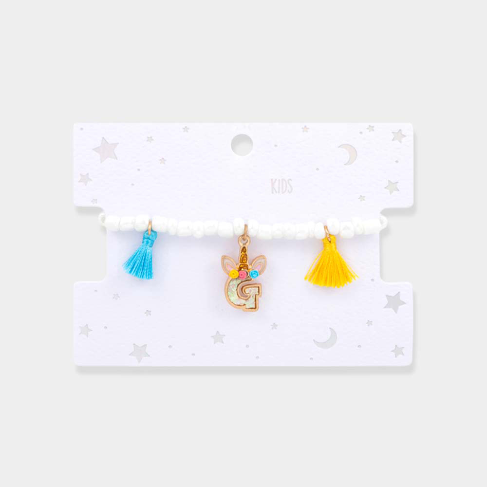 -G- Unicorn Initial Monogram Tassel Station Kids Beaded Stretch Bracelet
