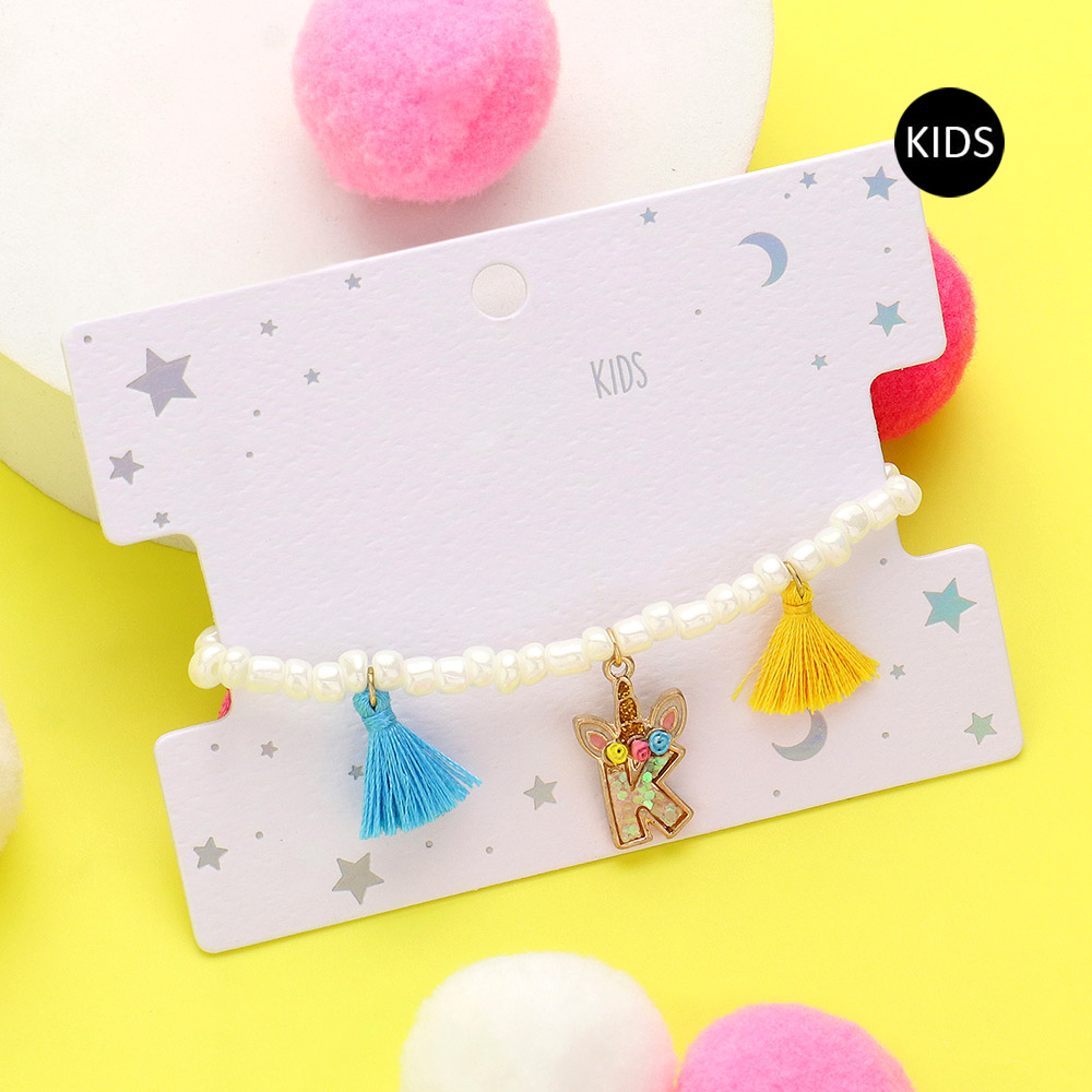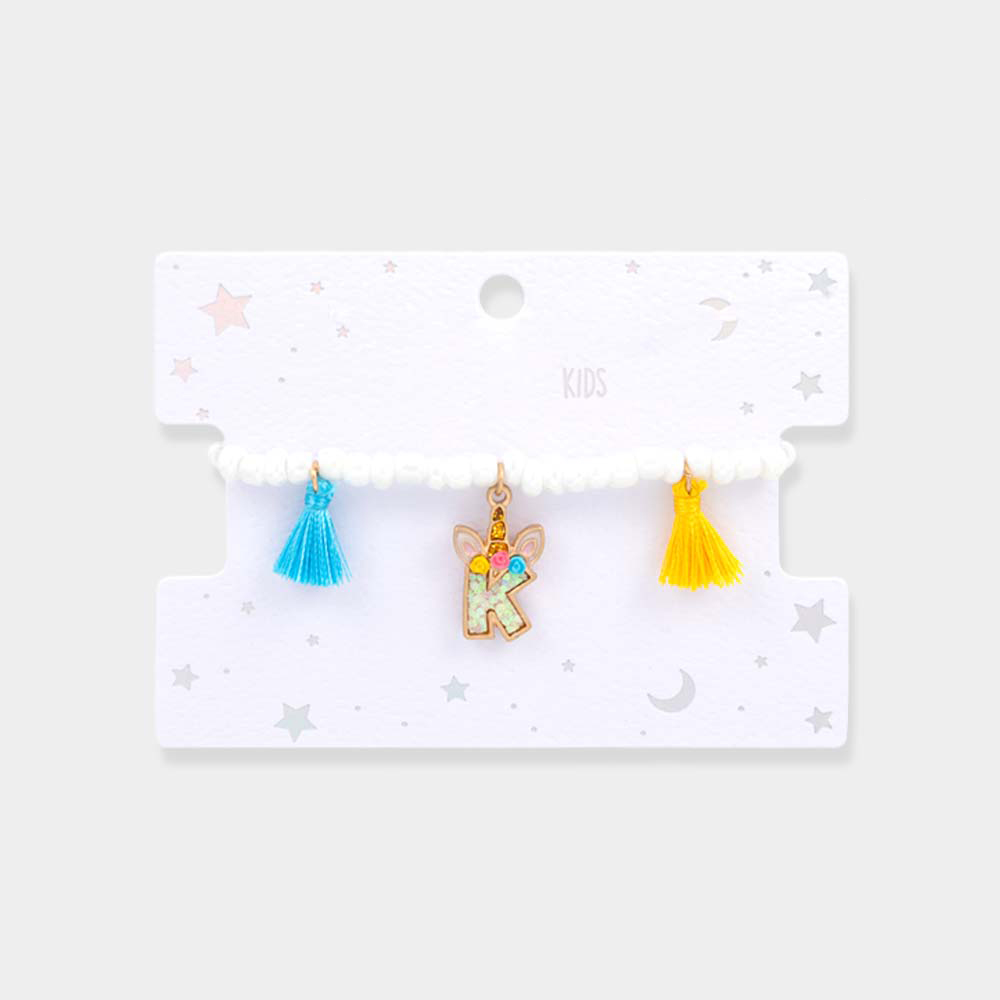 -K- Unicorn Initial Monogram Tassel Station Kids Beaded Stretch Bracelet