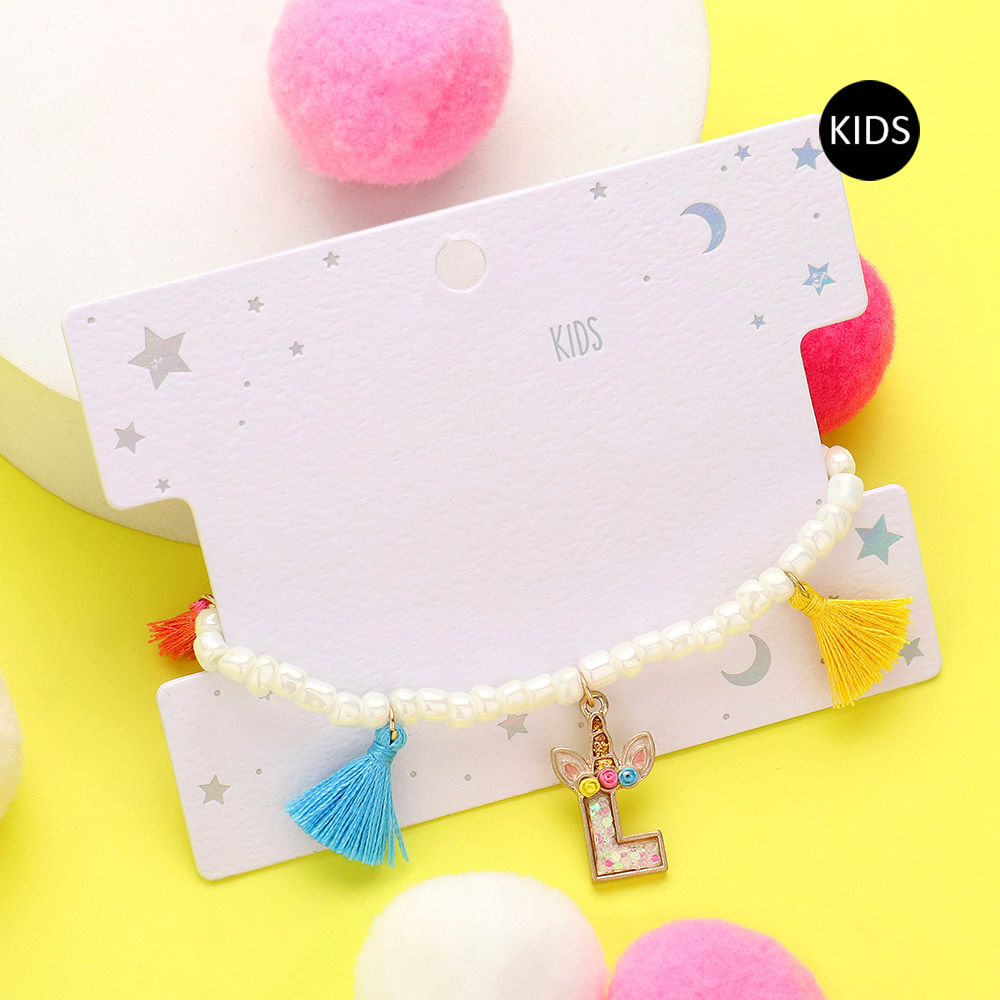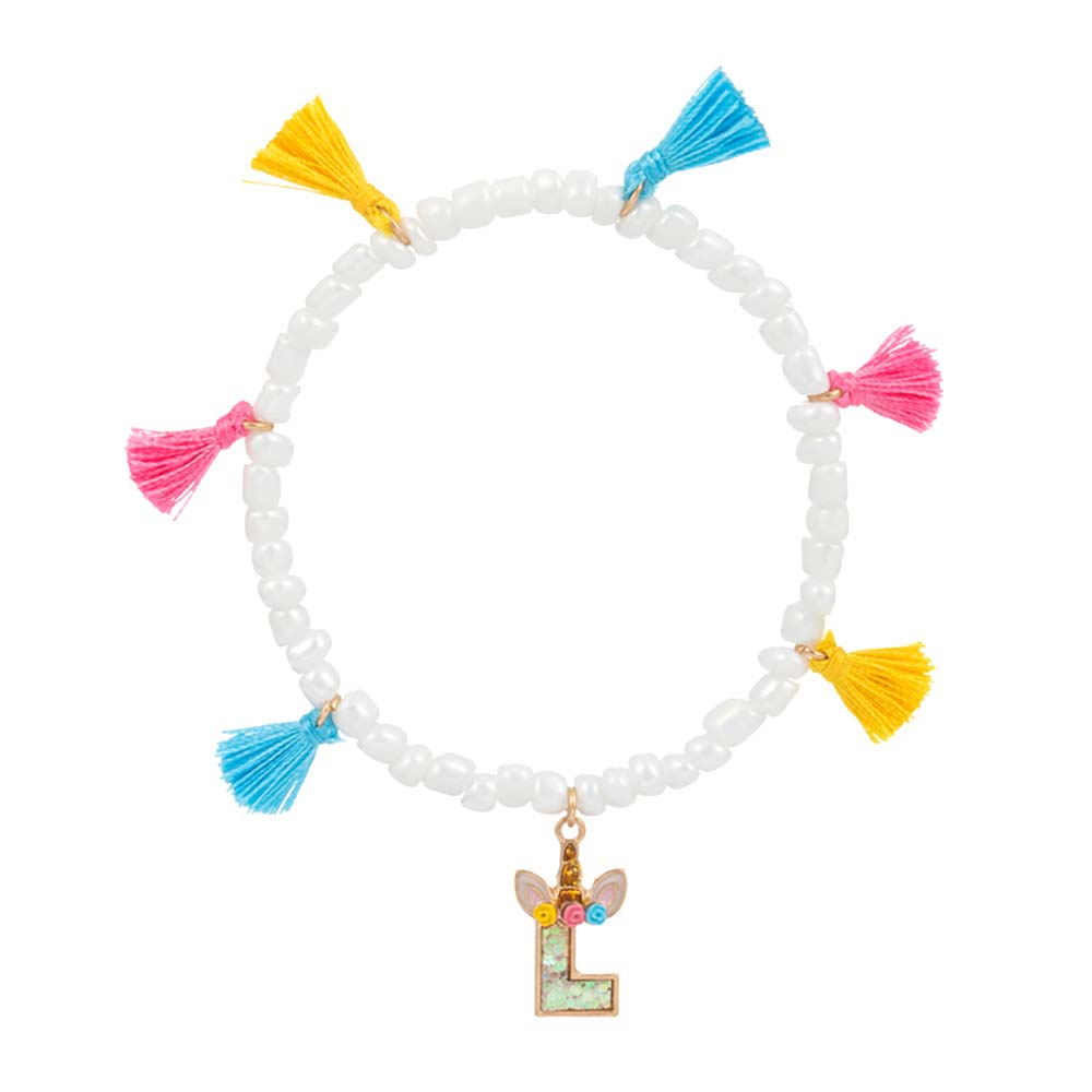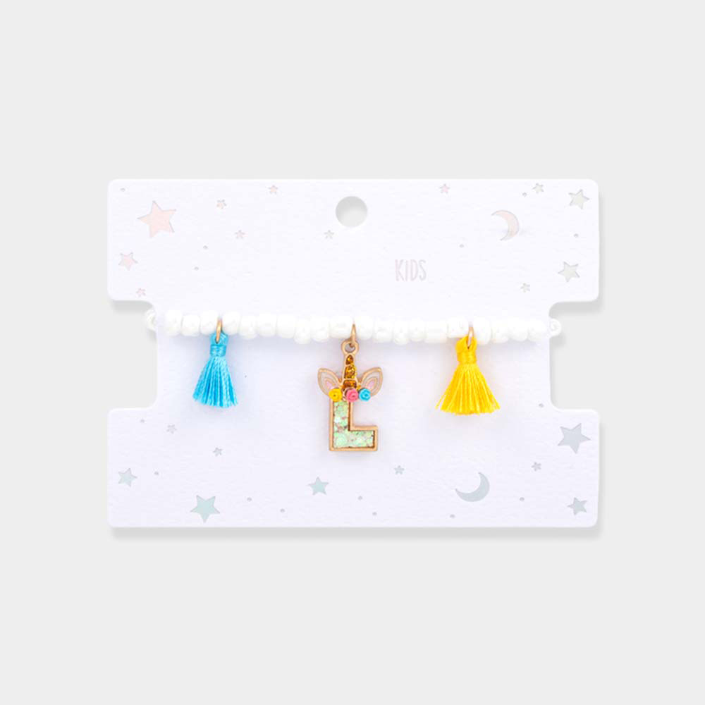 -L- Unicorn Initial Monogram Tassel Station Kids Beaded Stretch Bracelet