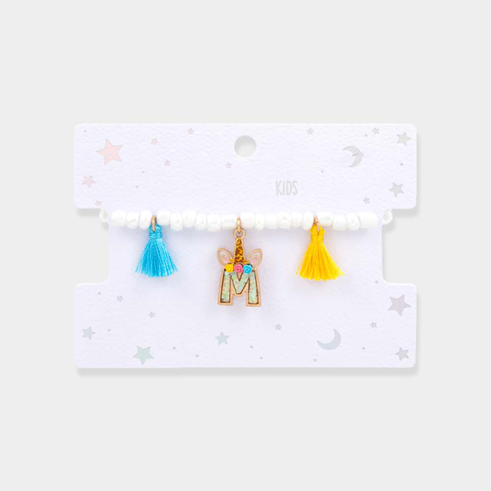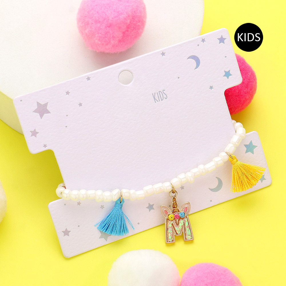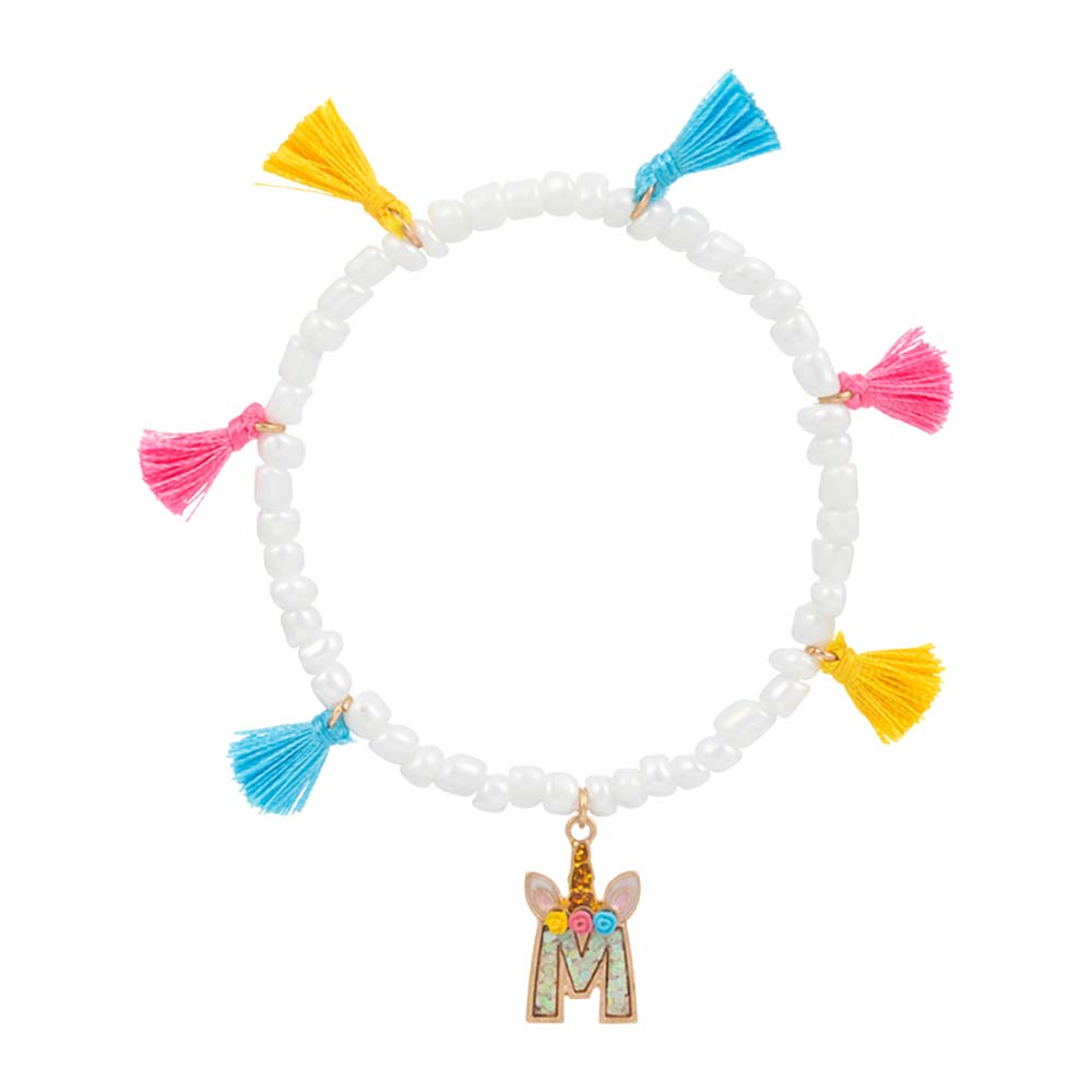 -M- Unicorn Initial Monogram Tassel Station Kids Beaded Stretch Bracelet