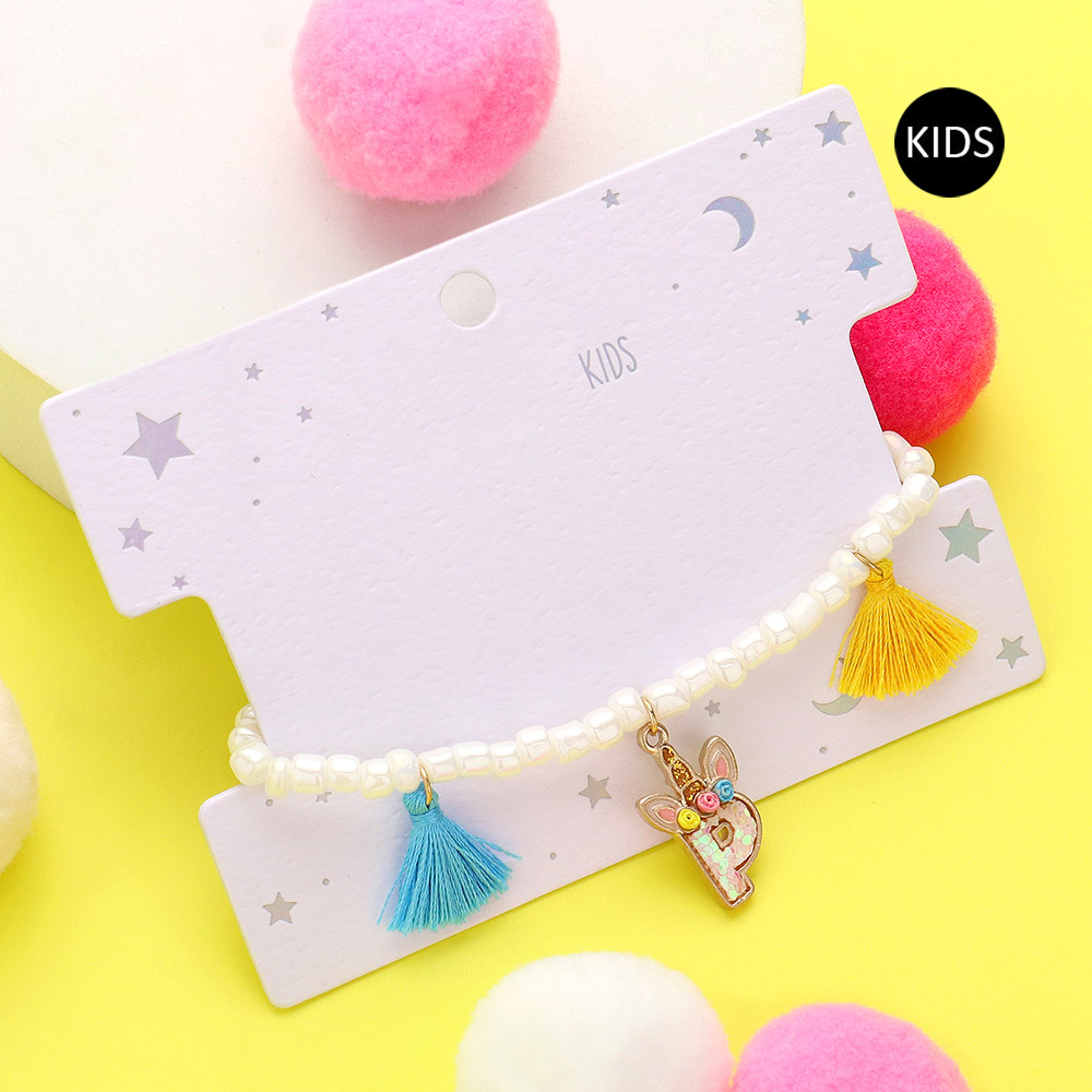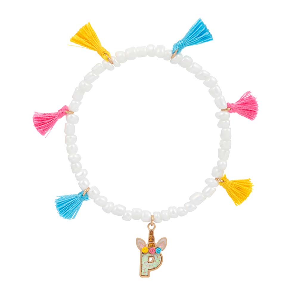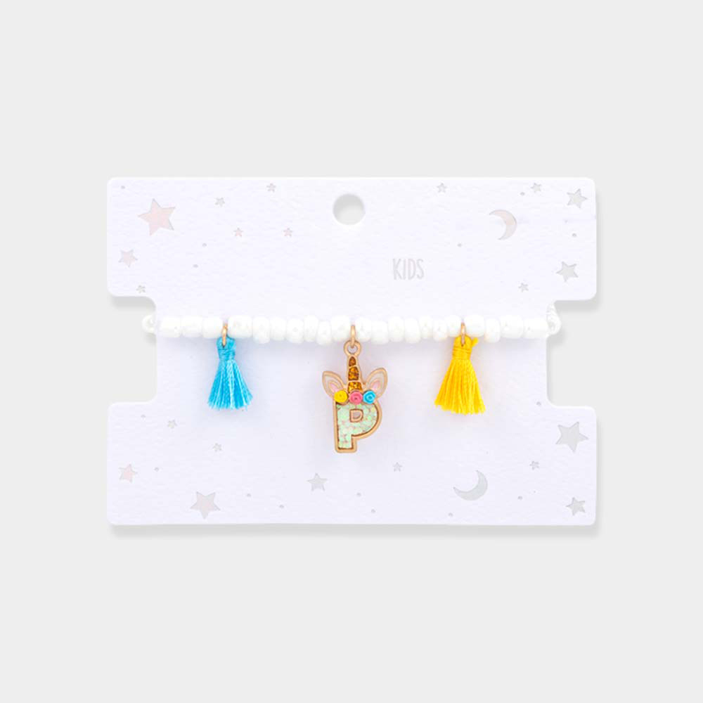 -P- Unicorn Initial Monogram Tassel Station Kids Beaded Stretch Bracelet