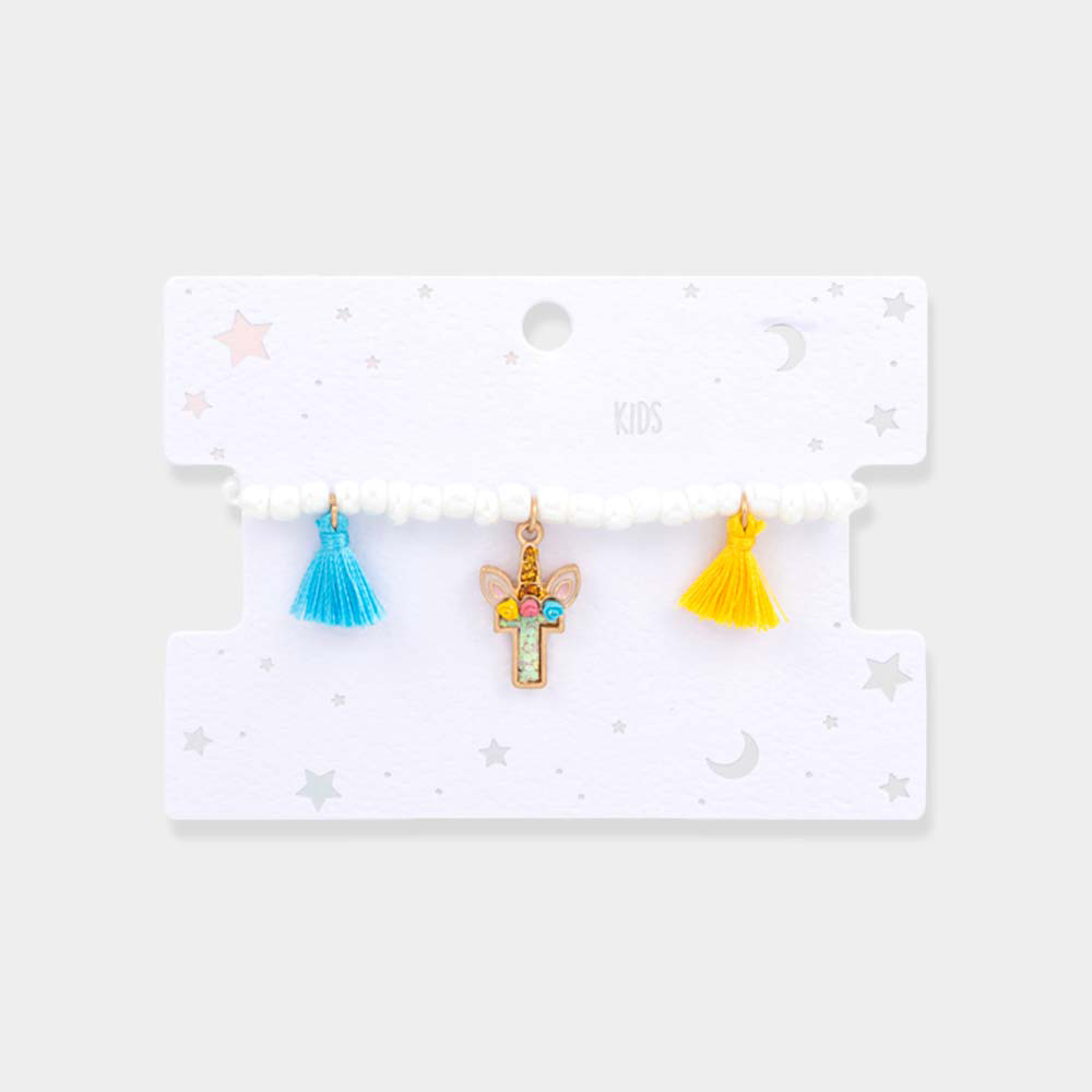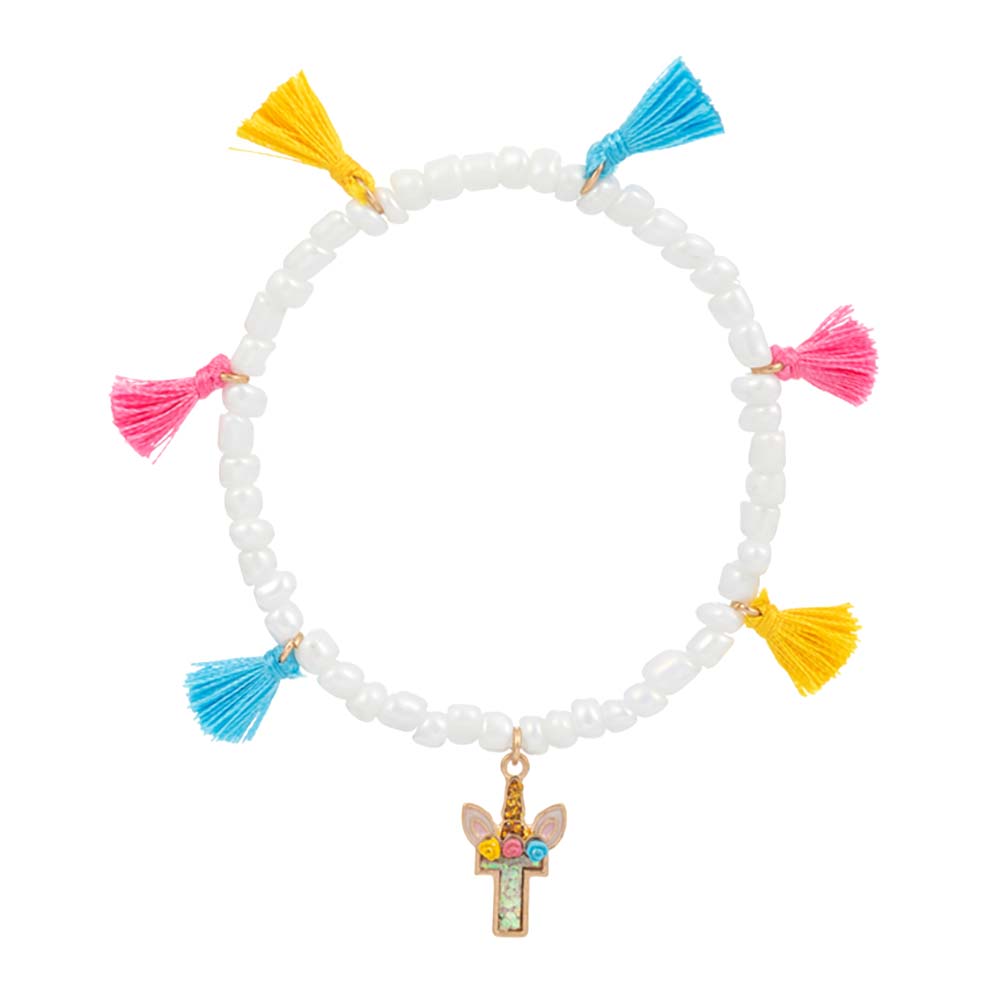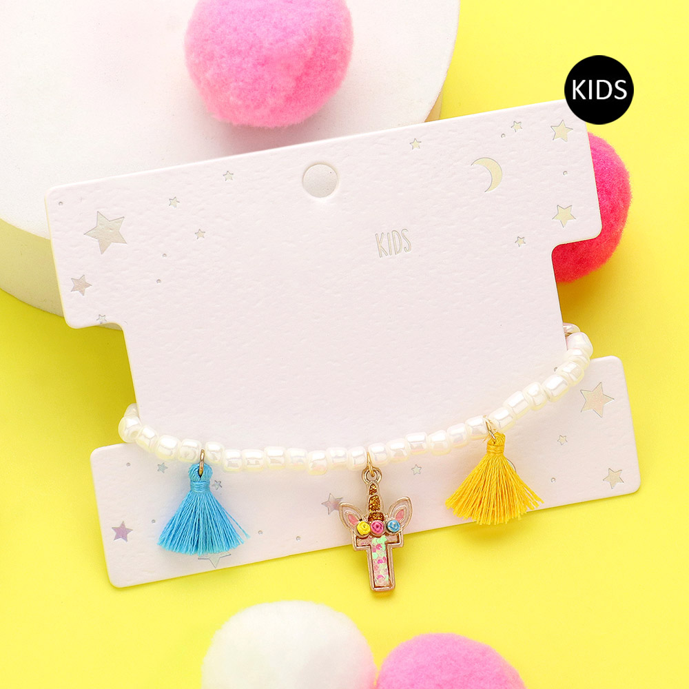 -K- Unicorn Initial Monogram Tassel Station Kids Beaded Stretch Bracelet