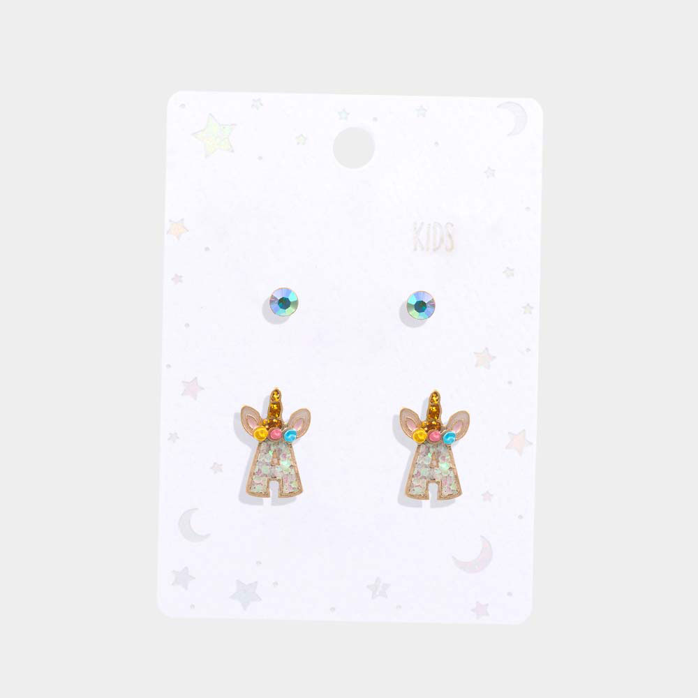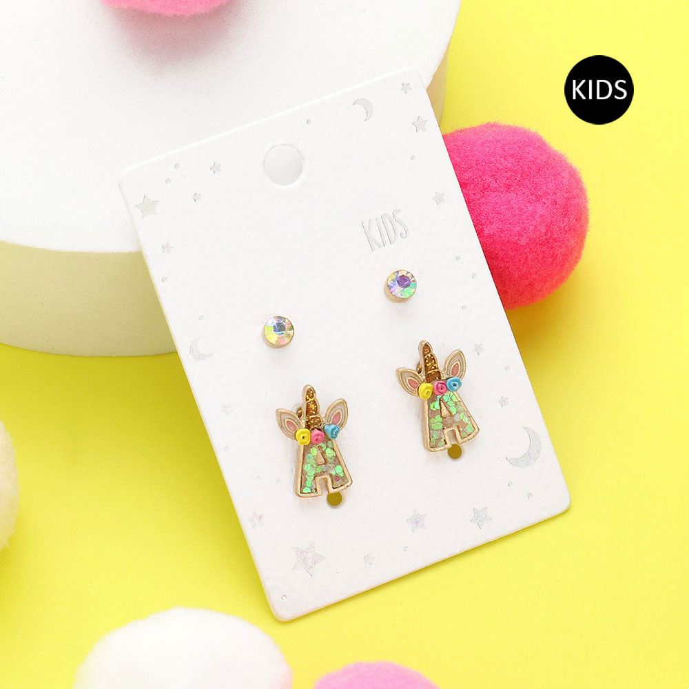 2Pairs - A Round Stone Unicorn Initial Monogram Stud Kids Earrings
