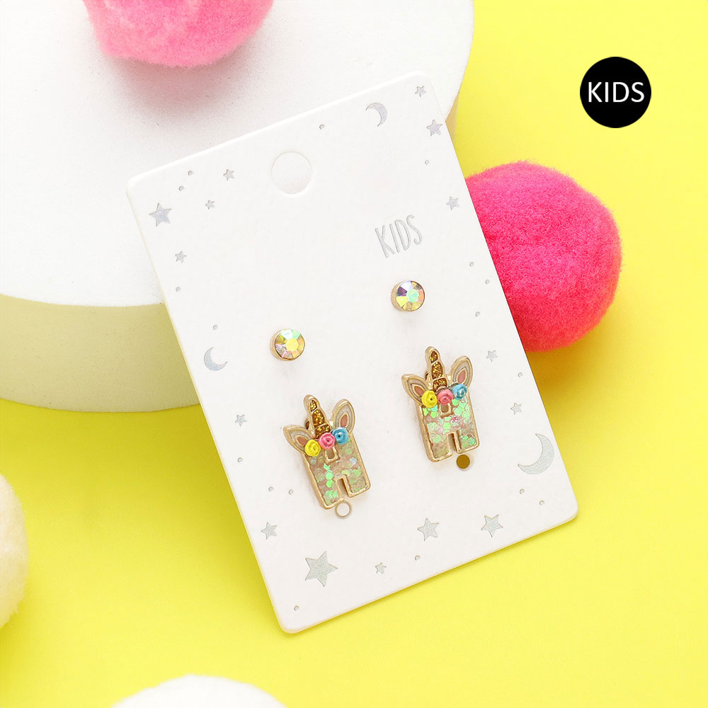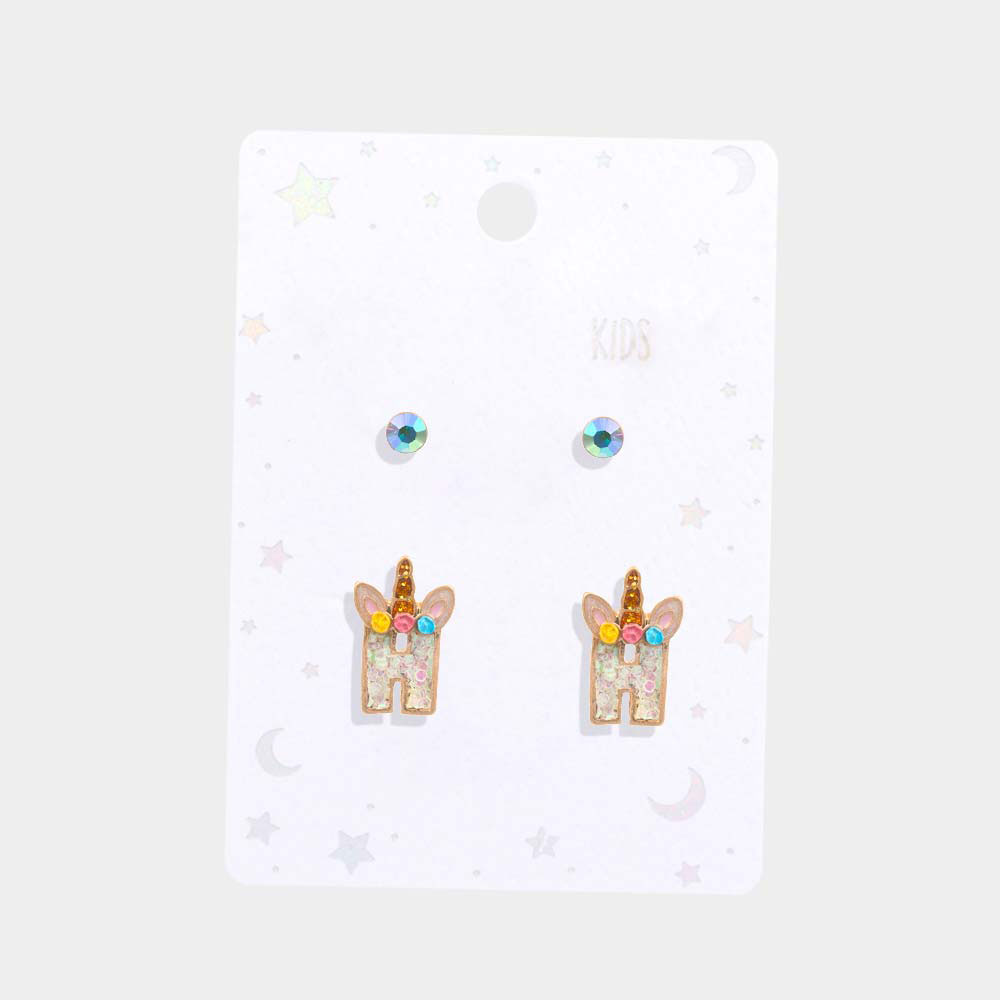 2Pairs - A Round Stone Unicorn Initial Monogram Stud Kids Earrings