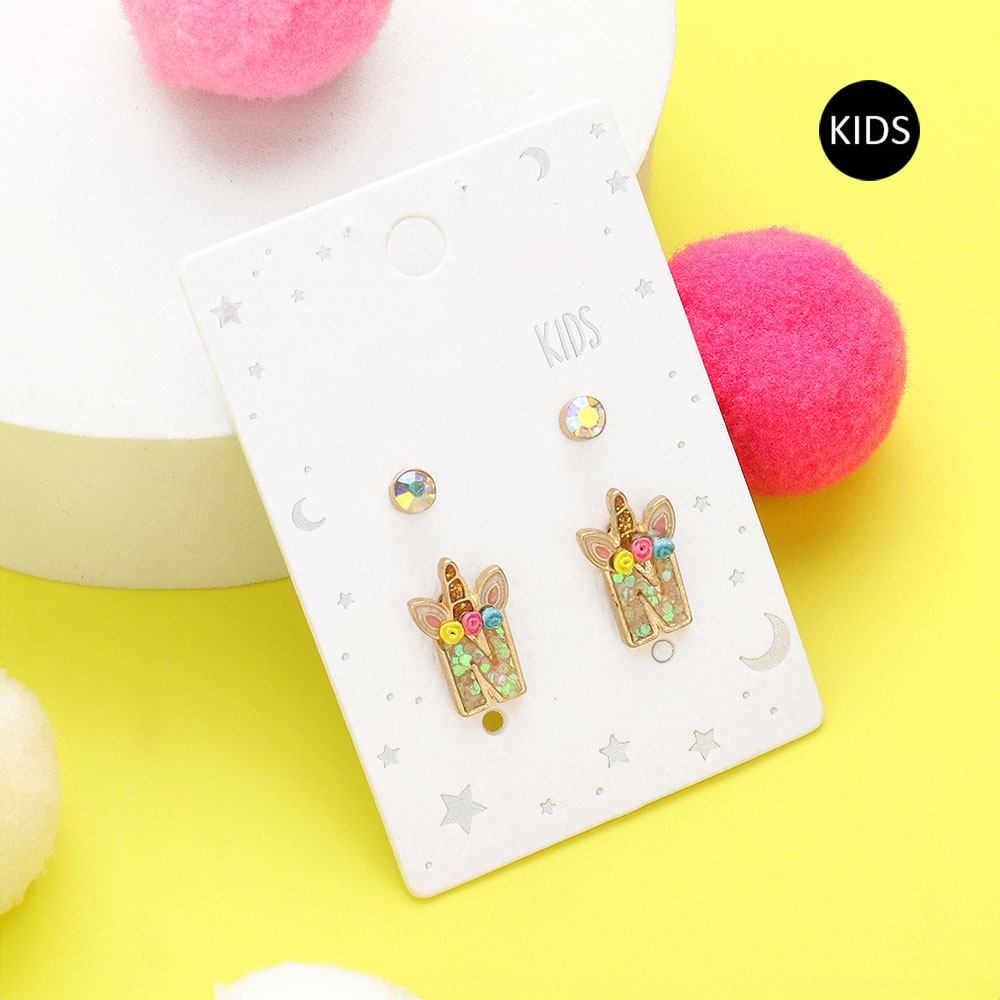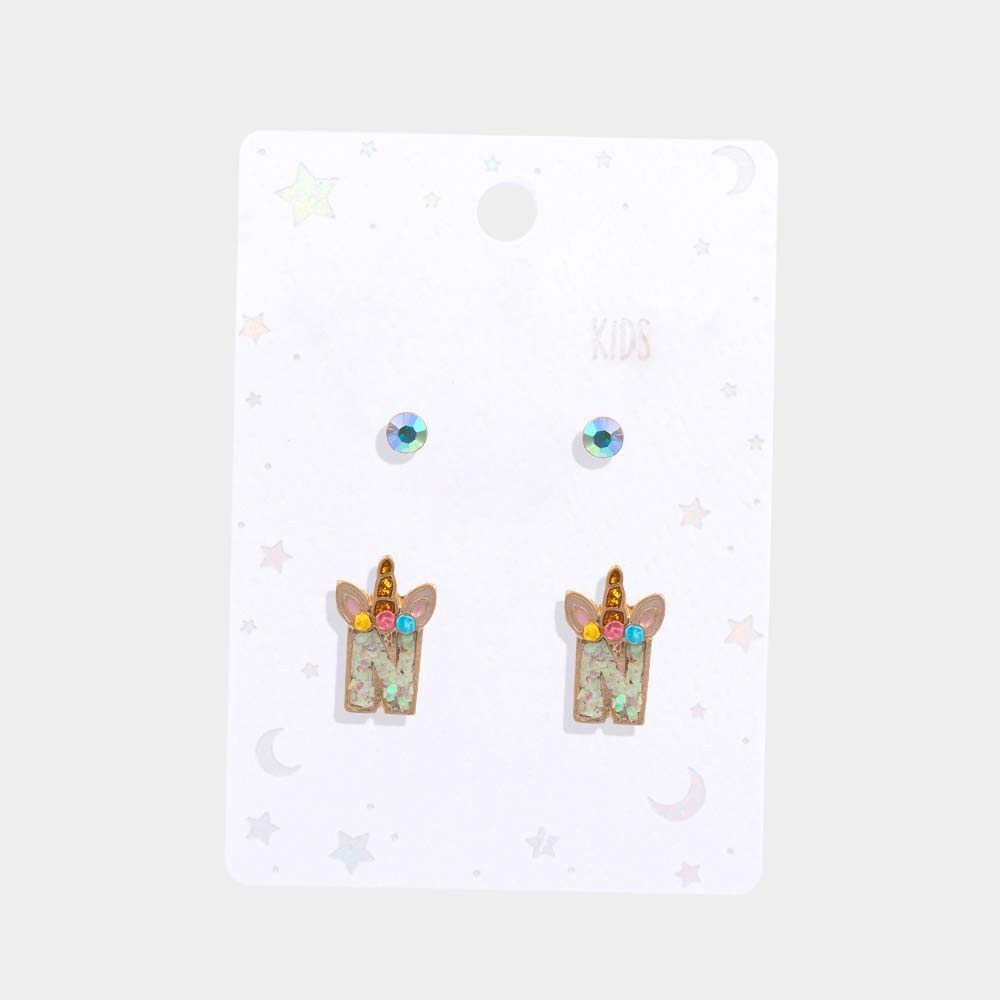 2Pairs - A Round Stone Unicorn Initial Monogram Stud Kids Earrings