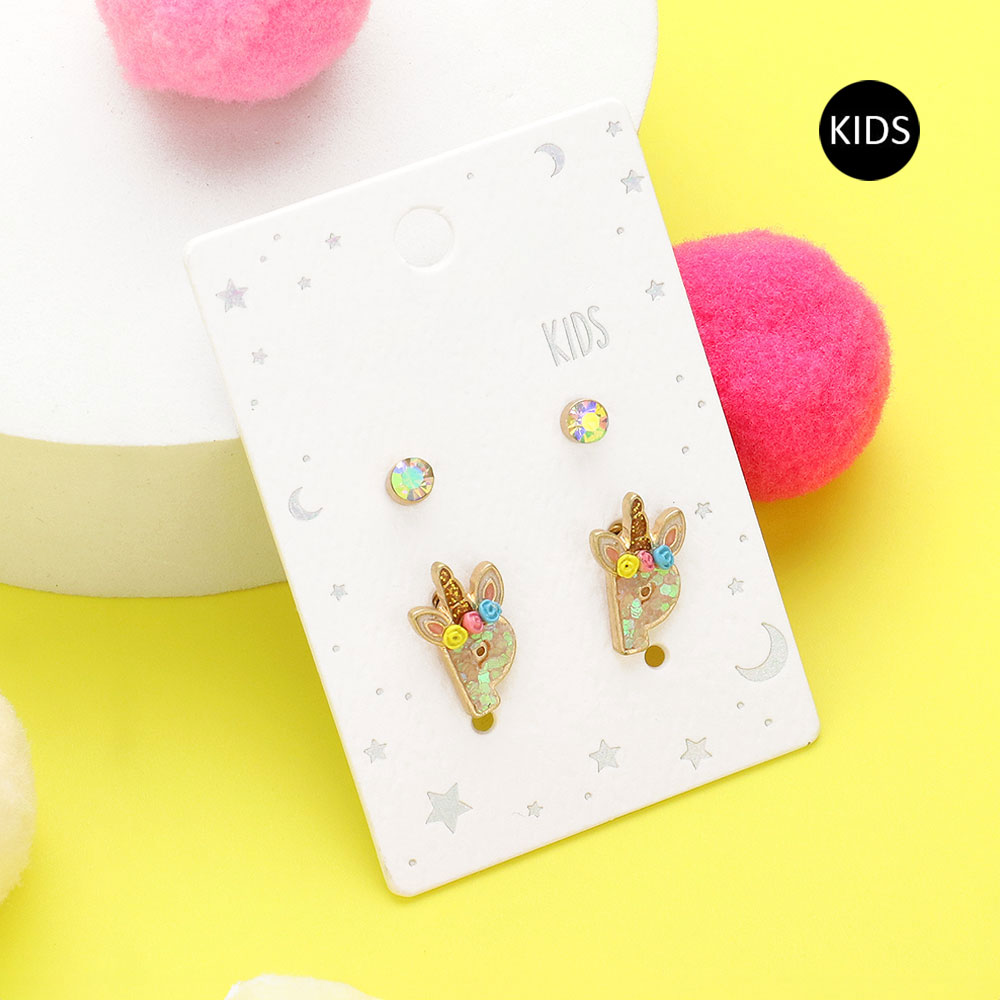 2Pairs - A Round Stone Unicorn Initial Monogram Stud Kids Earrings