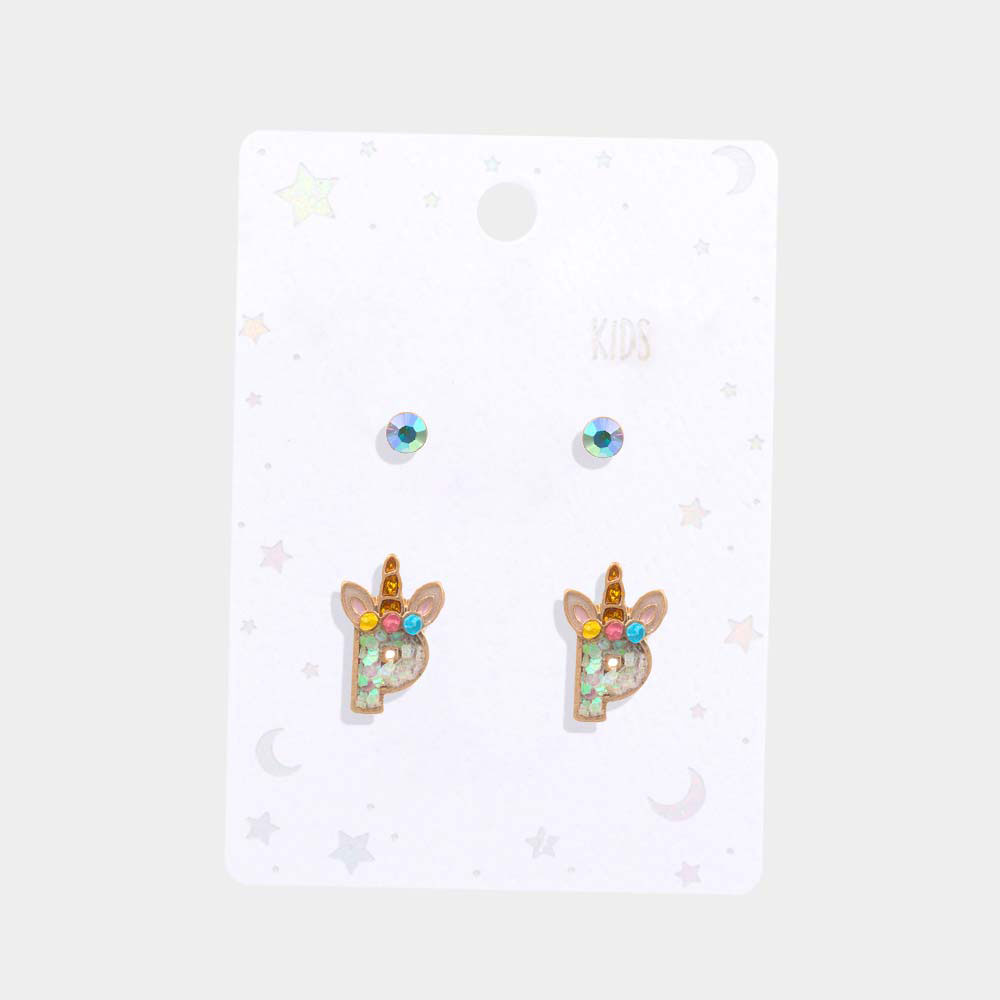 2Pairs - P Round Stone Unicorn Initial Monogram Stud Kids Earrings