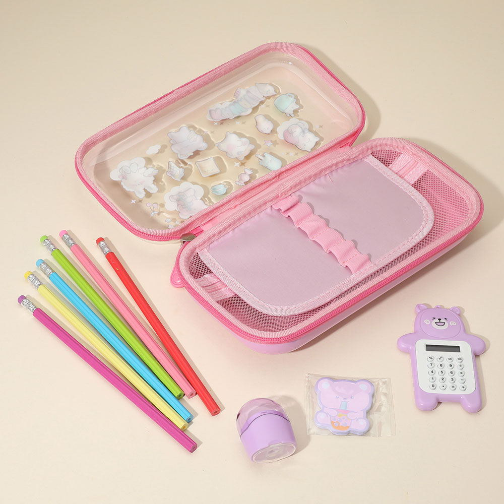 Details • Case Size : 9.25" X 5" X 2.25" • Pencil Size : 7.25" L • Sharpener Size : 1.75" L • Sticky Notepad Size : 2.1" L • Calculator Size : 3.75" L • 1 travel organizer case, 6 erasable color pencils, 1 pencil sharpener, 1 sticky notepad and 1 mini calculator included • Fun kawaii-themed hard pencil case set includes pencils, bear calculator, sharpener, eraser, and cute animal designs on a transparent cover. This all-in-one school supply kit is perfect for kids who love playful, cheerful accessories that stay organized and travel-ready.