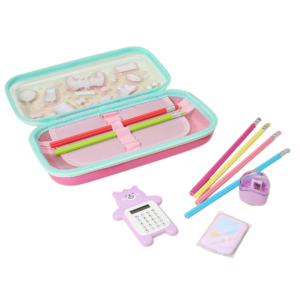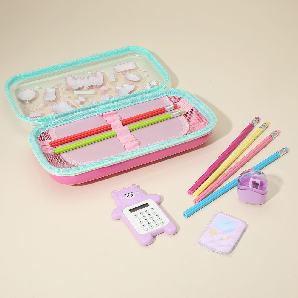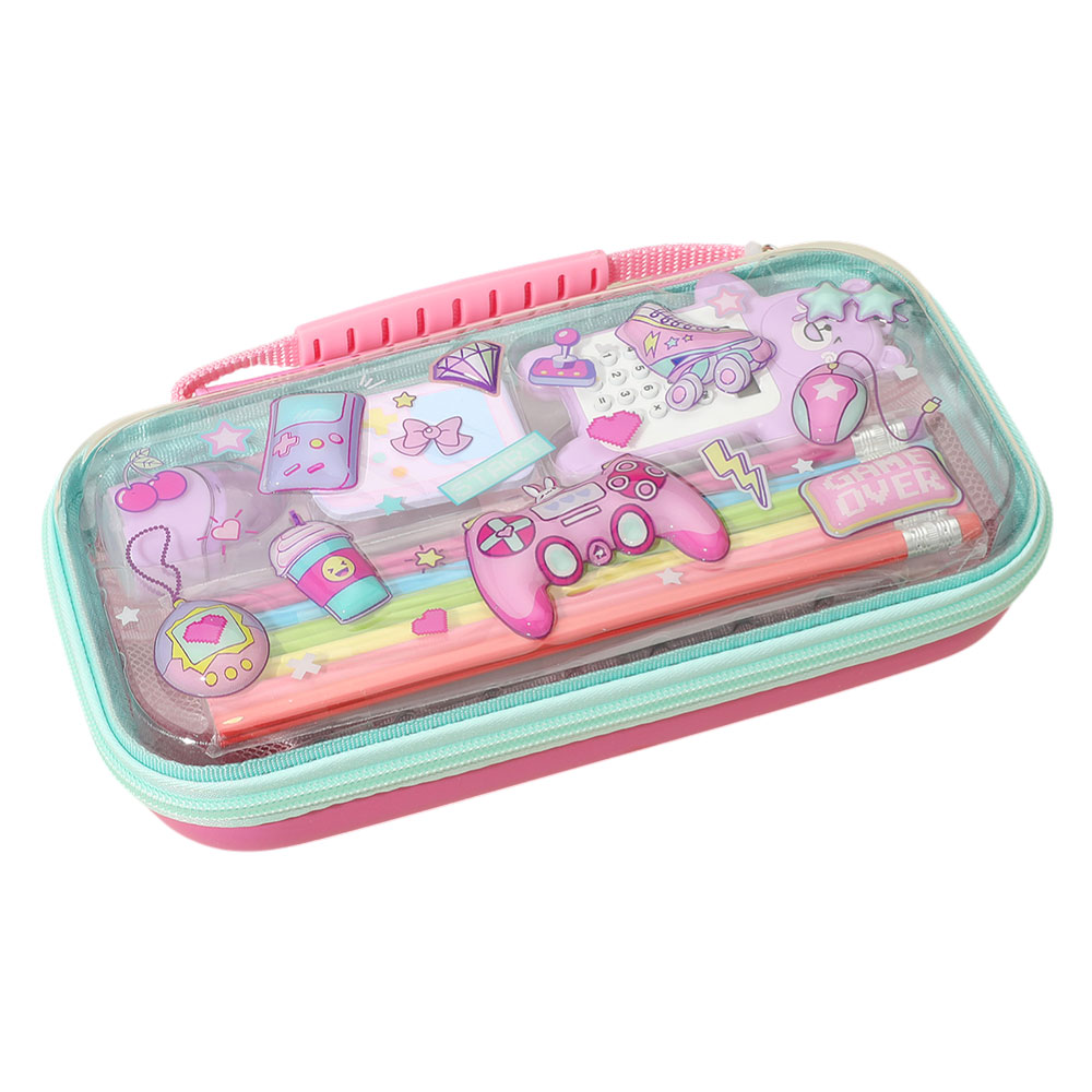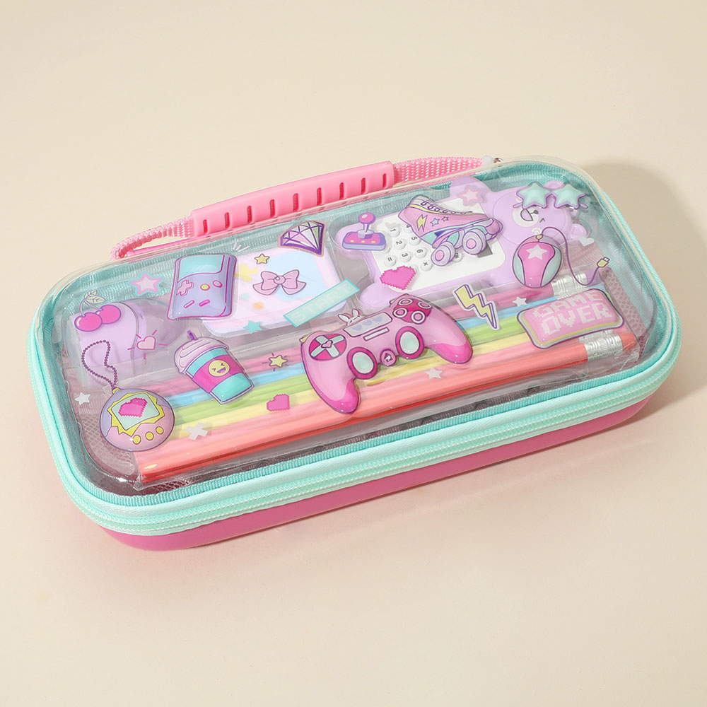 Details • Case Size : 9.25" X 5" X 2.25" • Pencil Size : 7.25" L • Sharpener Size : 1.75" L • Sticky Notepad Size : 2.1" L • Calculator Size : 3.75" L • 1 travel organizer case, 6 erasable color pencils, 1 pencil sharpener, 1 sticky notepad and 1 mini calculator included • This fun hard shell pencil case features playful gamer and snack-themed icons with a double zipper and internal mesh compartments. Designed for secure, spacious storage of pens, pencils, and school supplies, it’s perfect for kids who love colorful, functional accessories.