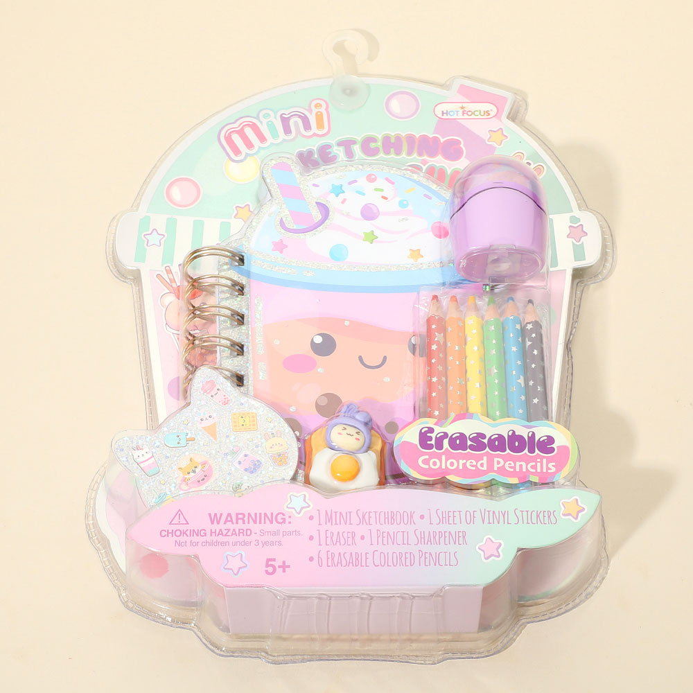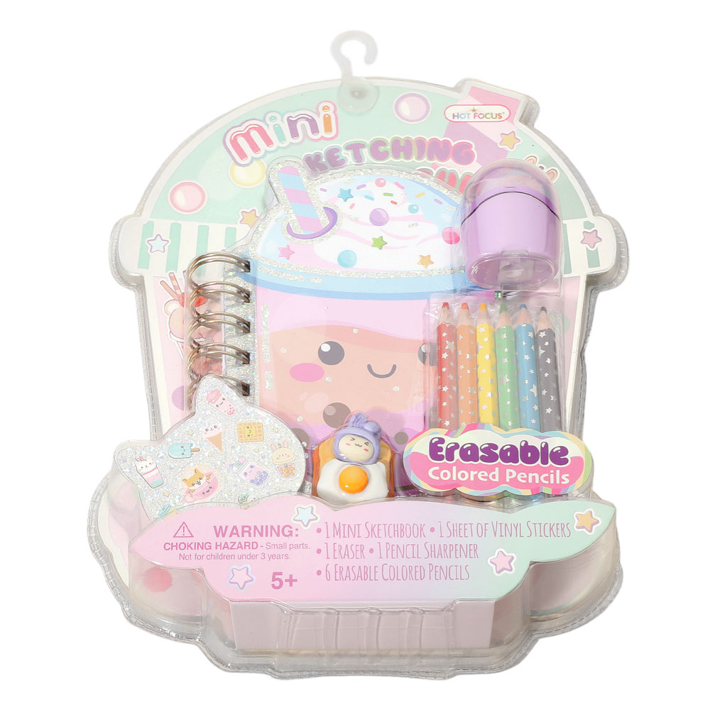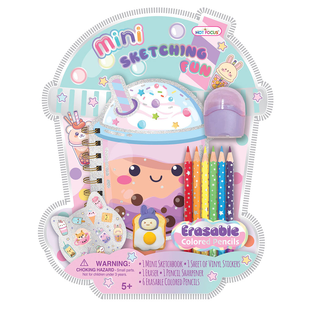 Details • Eraser Size : 1.5" L • Pencil Sharpener Size : 1.5" X 1.75" • Colored Pencil Size : 3.6" L • Mini Sketchbook Size : 4.5" X 5.5" • Sticker Size : 2.3" X 2.25" • 1 mini sketchbook, 1 sheet of vinyl stickers, 1 eraser, 1 pencil sharpener and 6 erasable colored pencils included • This 10-piece mini sketching kit includes a spiral sketchbook, vinyl sticker sheet, eraser, sharpener, and 6 erasable colored pencils. Packed in a fun-shaped case, it’s a creative, portable gift for kids who love to draw, color, and personalize their art supplies.