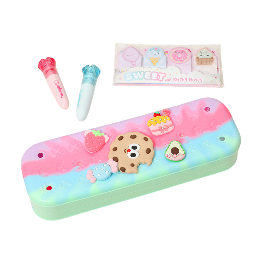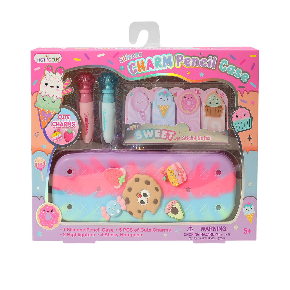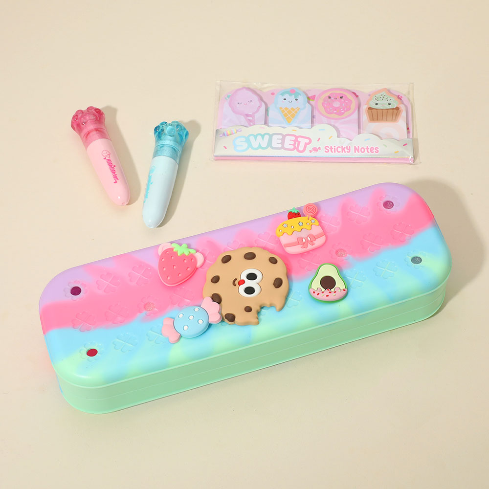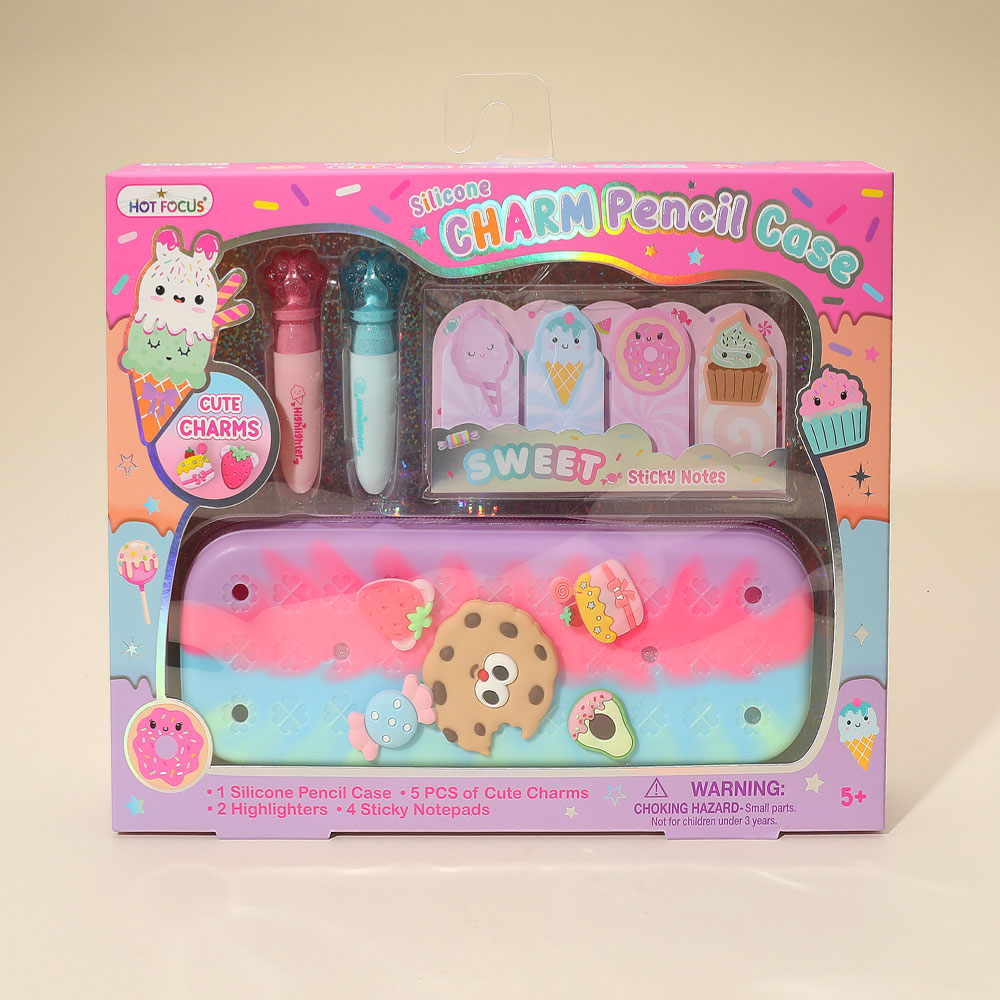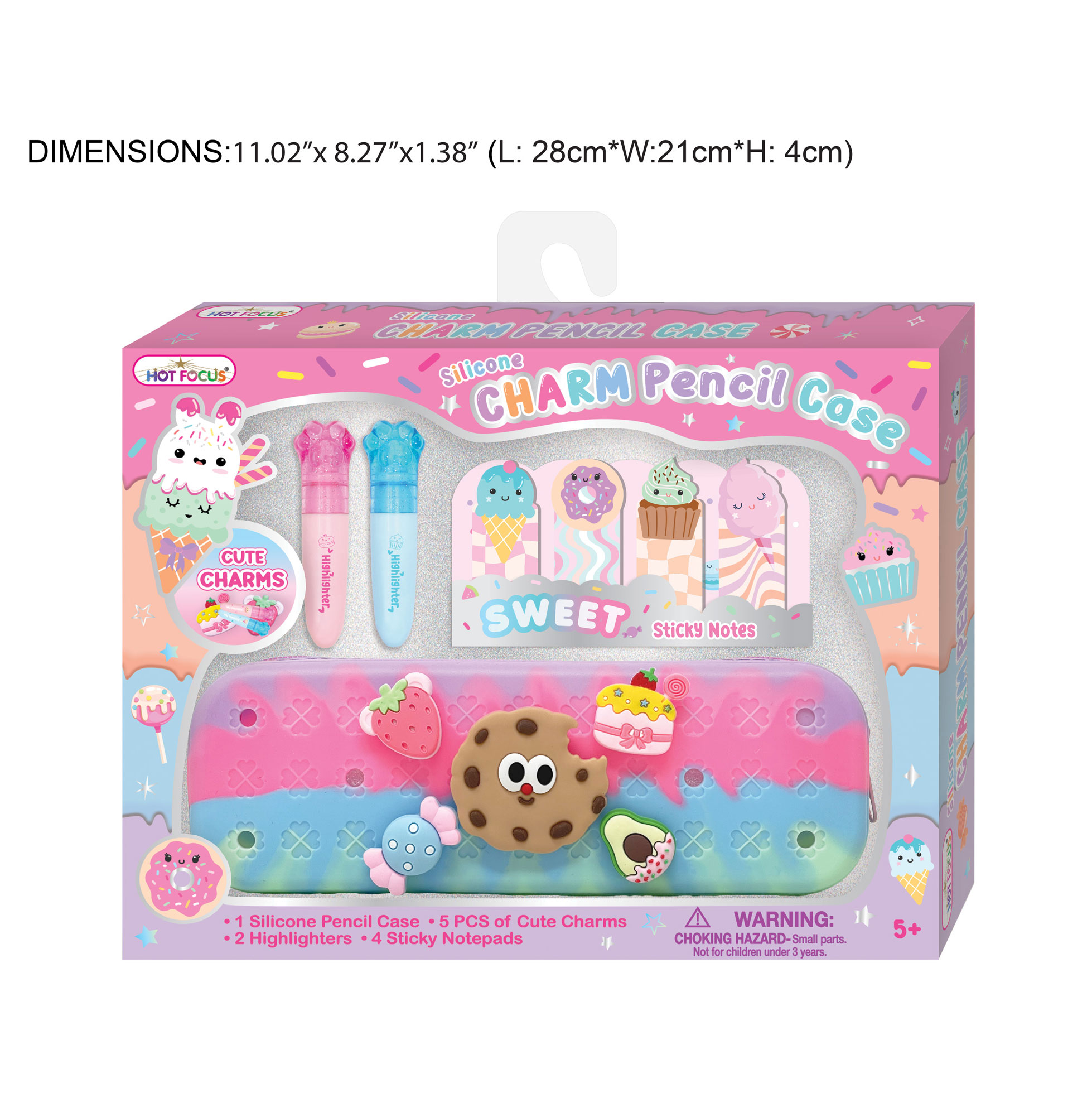 Details • Pencil Case Size : 8.5" X 3" • Sticky Notepad Size : 4.75" X 2.2" • Highlighter Size : 3" L • 1 silicone pencil case, 5 pcs of cute charms for pencil case, 2 highlighters and 4 sticky notepads included • This adorable set includes a silicone pencil case with fun charms, 2 highlighters, and 4 sticky notepads. Perfect for school or gifting, it combines practicality with playful design, keeping supplies organized while adding charm to any desk or backpack.