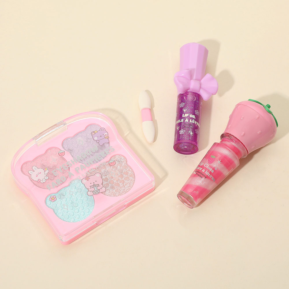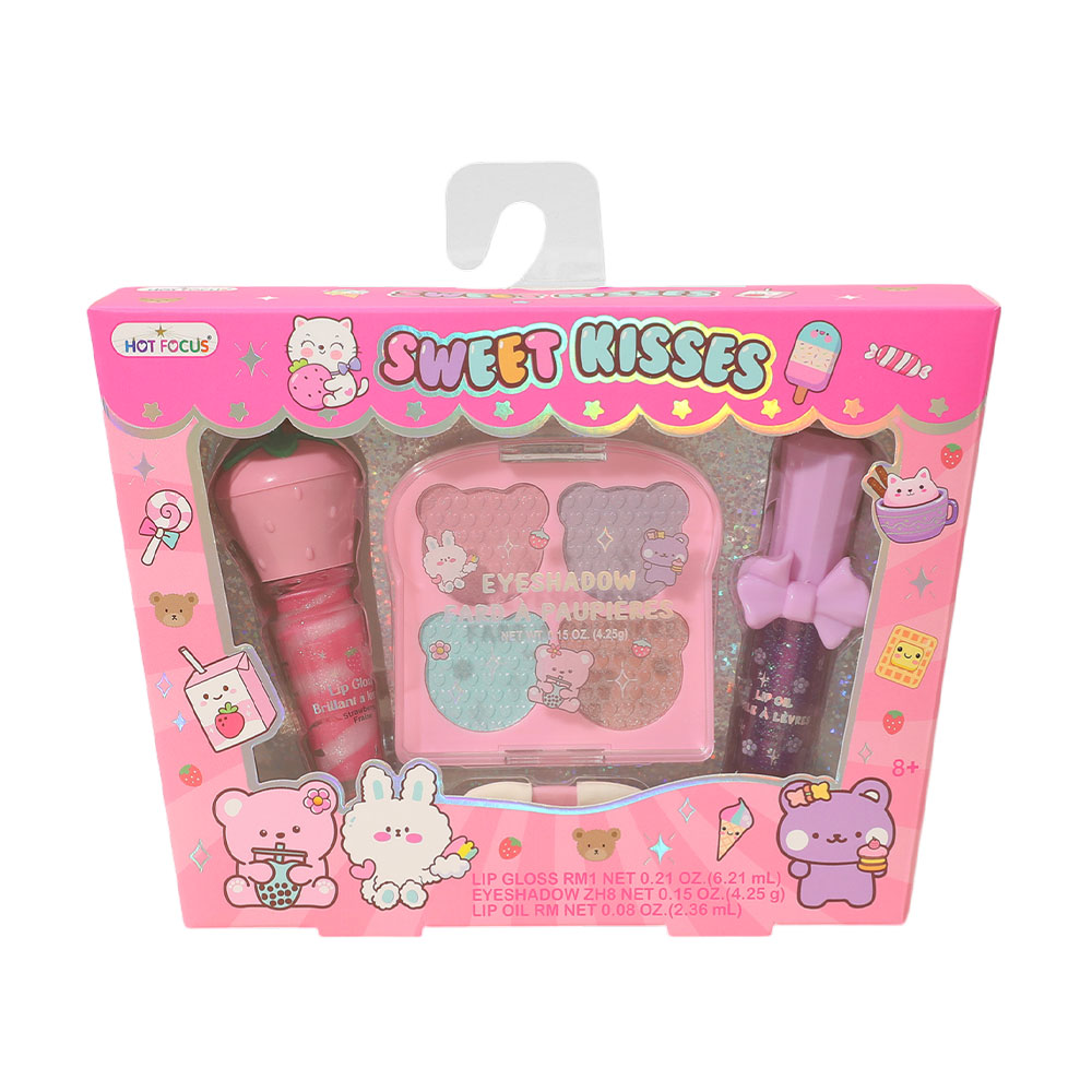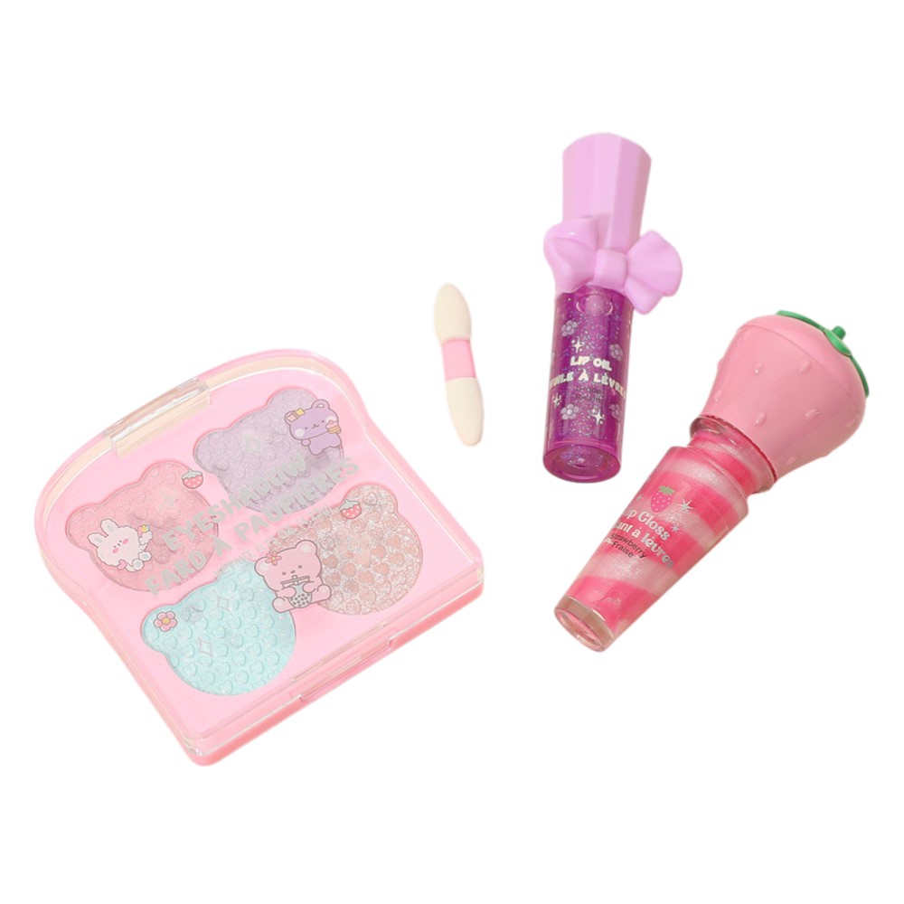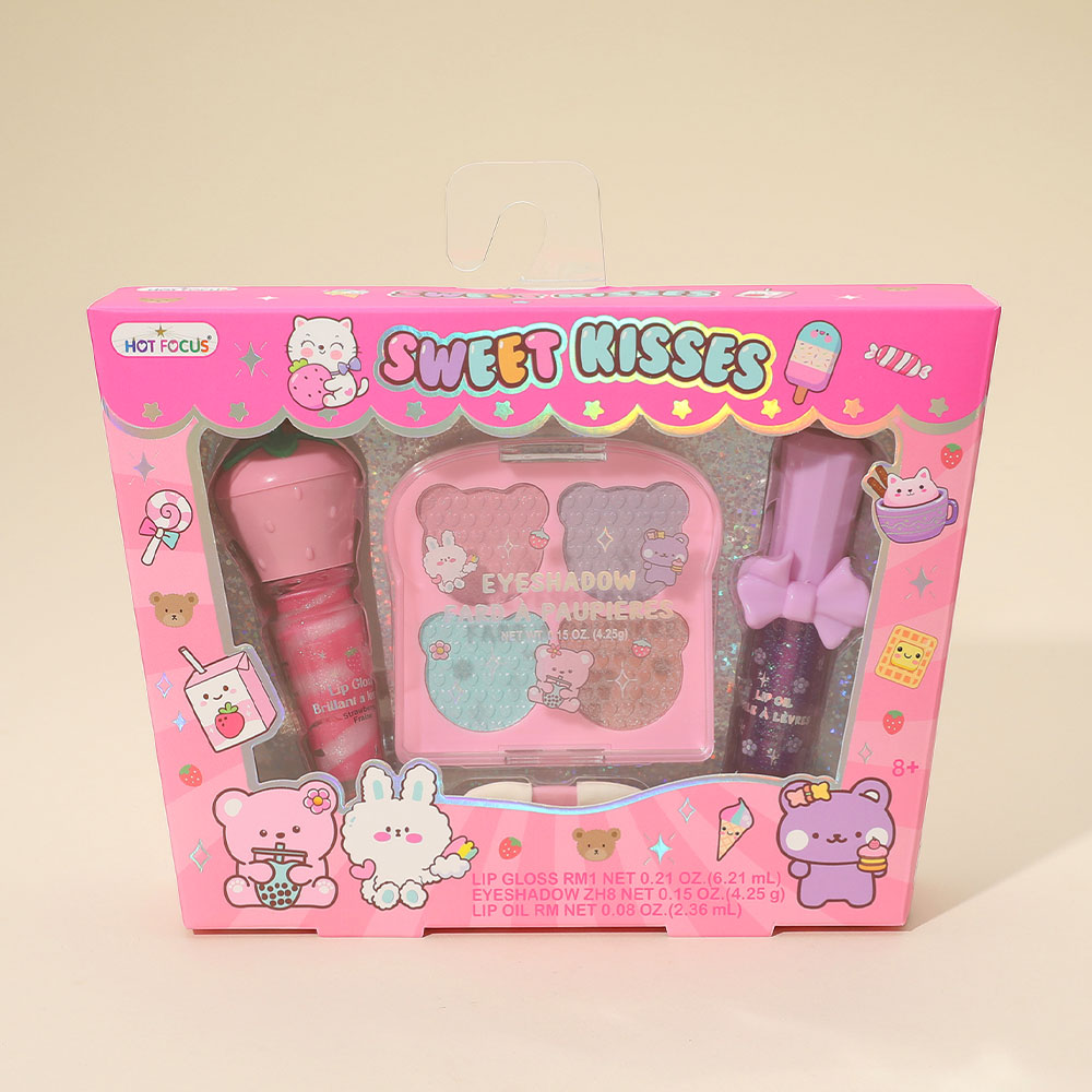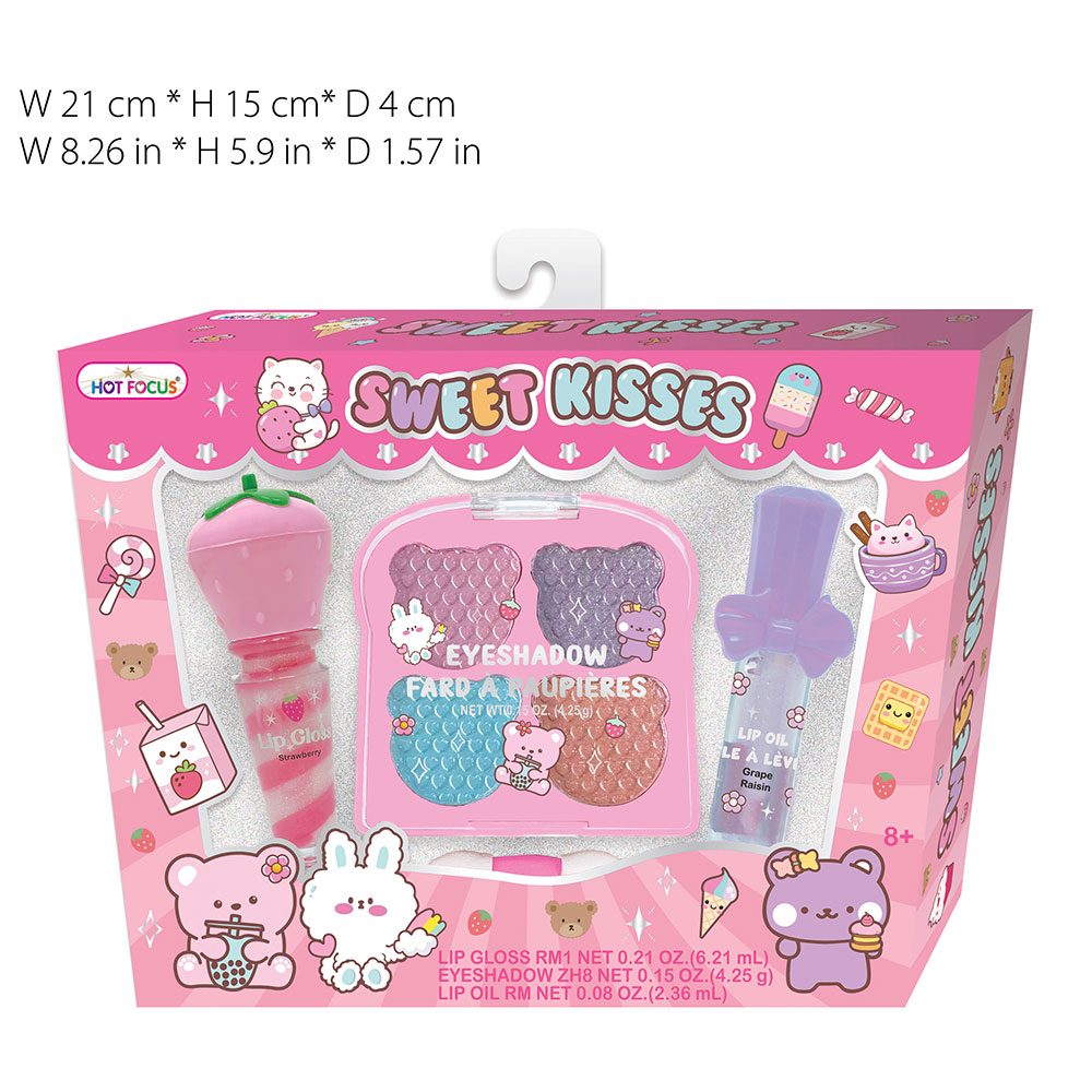 Details • Lip Gloss Size : 3.6" L / 0.21 fl.oz. (6.21ml) • Lip Oil Size : 3.7: L / 0.08 fl.oz.(2.36ml) • Eyeshadow Size : 3.2" X 3.1" / 0.15 oz. (4.25g) • 1 Lip Gloss, 1 Lip Oil, 1 Eyeshadow and 1 Eyeshadow Applicator Included • Sweet Kisses makeup kit includes lip gloss, lip oil, and a cute bear-shaped eyeshadow palette. Perfect for kids who love creative play and fun beauty products. A charming gift set for birthdays or holidays.