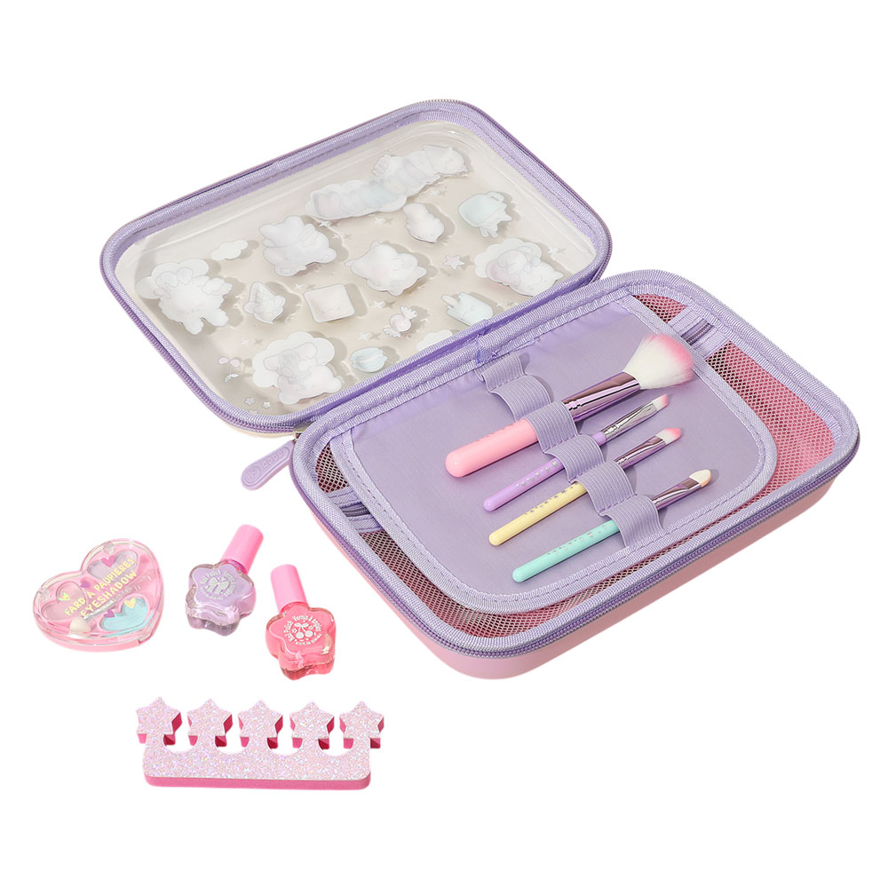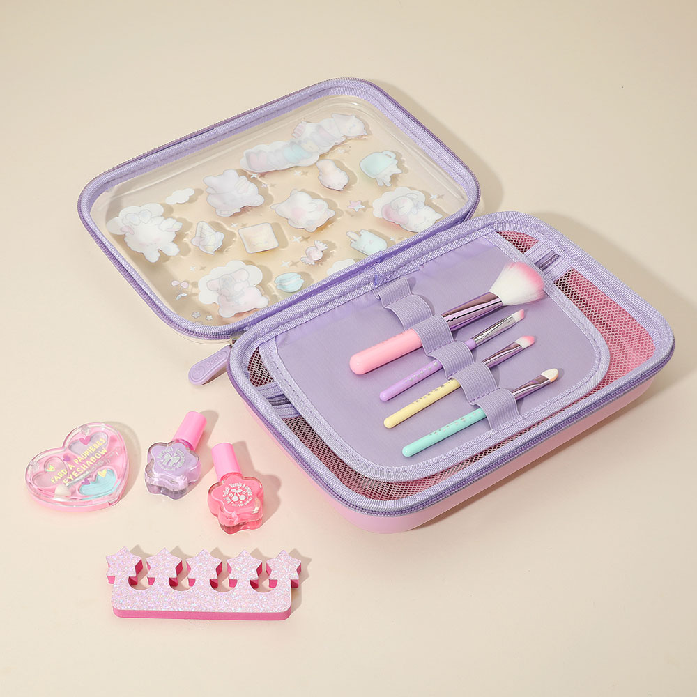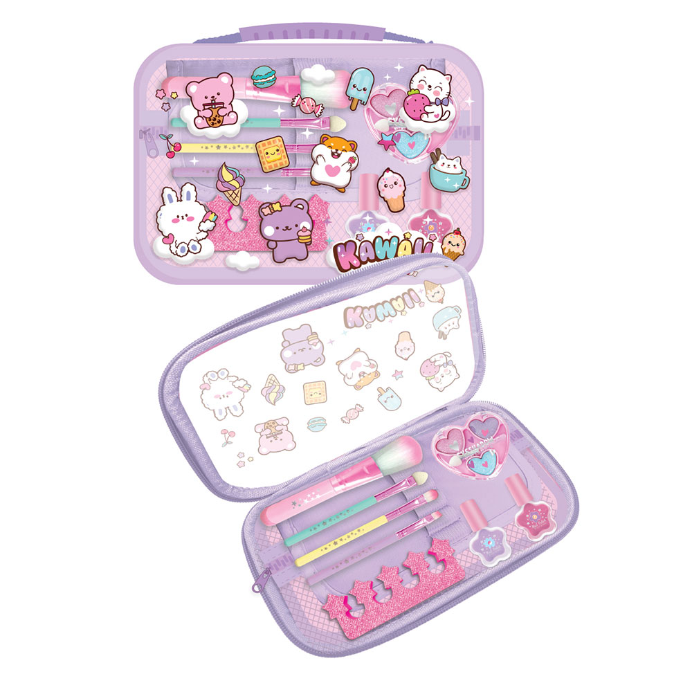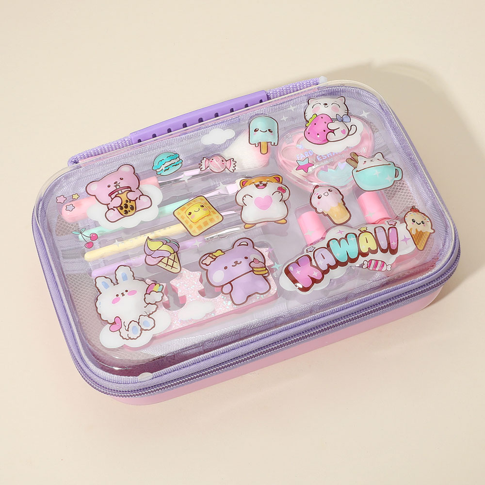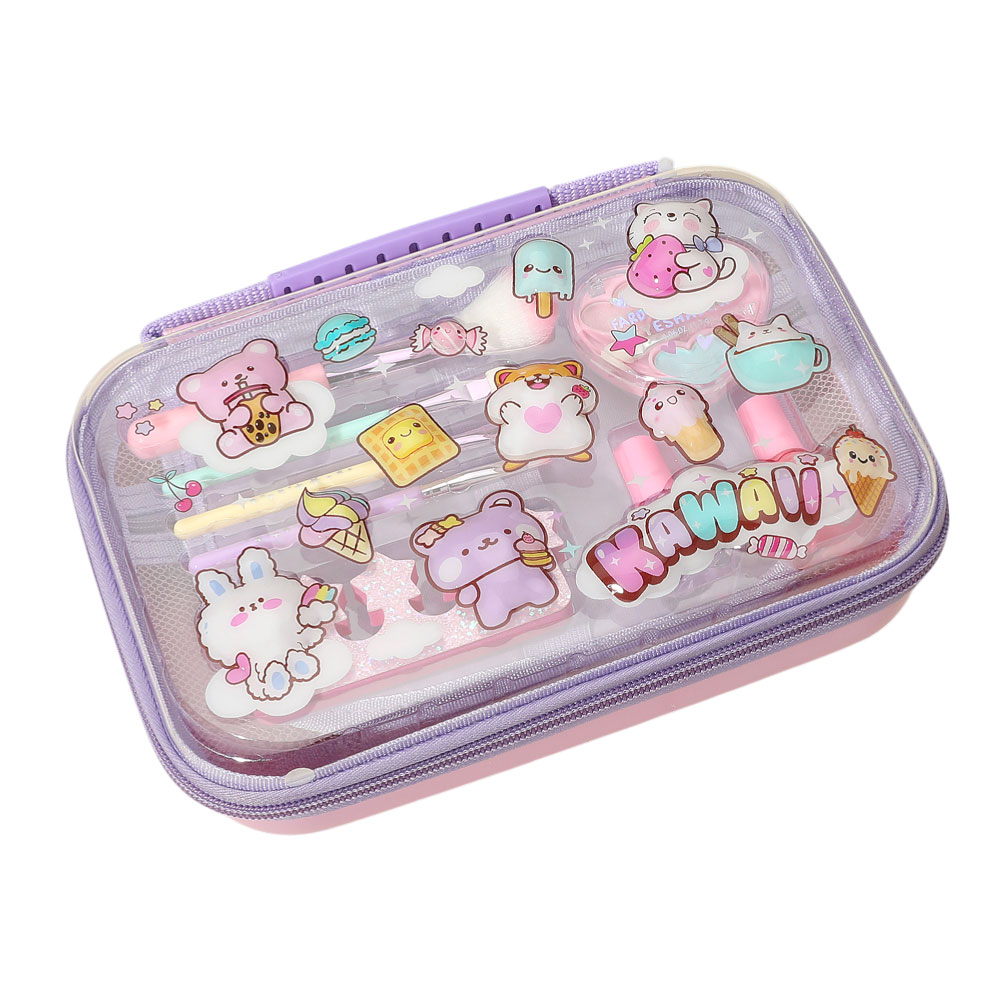 Details • Case Size : 8.5" X 6" X 2.25" • Eyeshadow Size : 2.3" X 2" / 0.12 fl.oz. (3.54 ml) • Nail Polish Size : 2" L • Toe Separator Size : 4" X 1.5" • Makeup Brush Size : 4" - 4.8" L • Fun and playful kawaii-themed kids stationery kit featuring charming character prints, pencils, erasers, lip gloss, and more in a clear zippered case. Ideal for school or gifting, this cute set encourages creativity and keeps supplies neatly organized.
