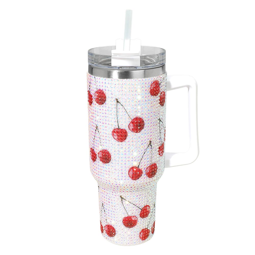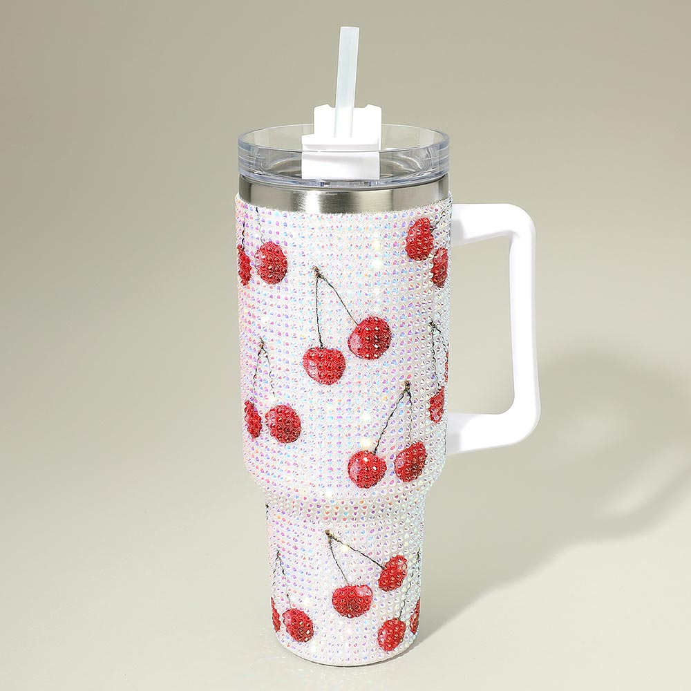Details • Size : 4" X 10.5" (40oz) • Straw Size : 12" L • Lid, Straw and Brushes Included • Double Wall Vacuum Insulation • Cup Holder Friendly • Hot and Cold • Stay stylish and hydrated with this 40oz tumbler featuring sparkling cherry designs in rhinestones. Comes with a sturdy handle and straw for easy sipping. Perfect for fruity flair on the go or a fun gift idea. • Stainless Steel