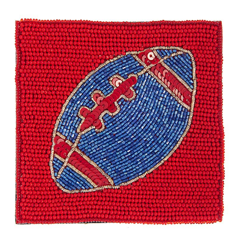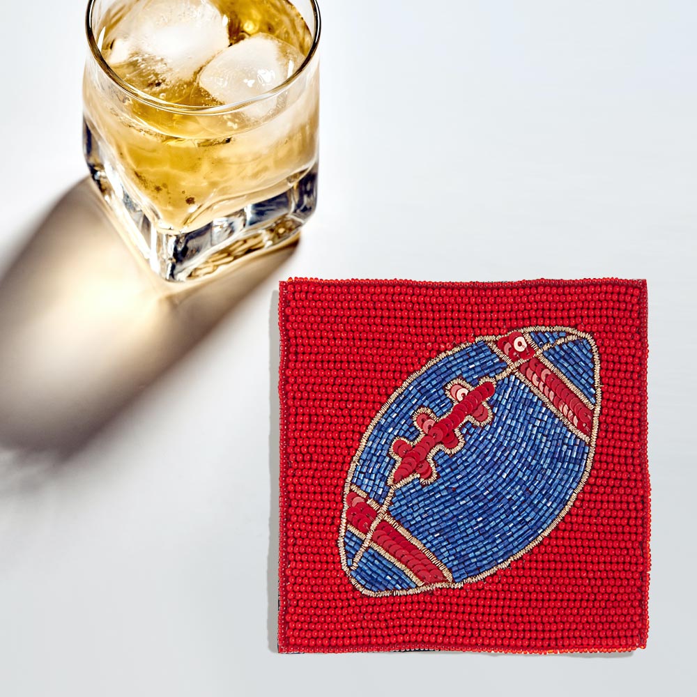• Add sporty charm to your gatherings with this handcrafted beaded football coaster. A fun and functional accessory to protect surfaces while celebrating game day with friends and family.
