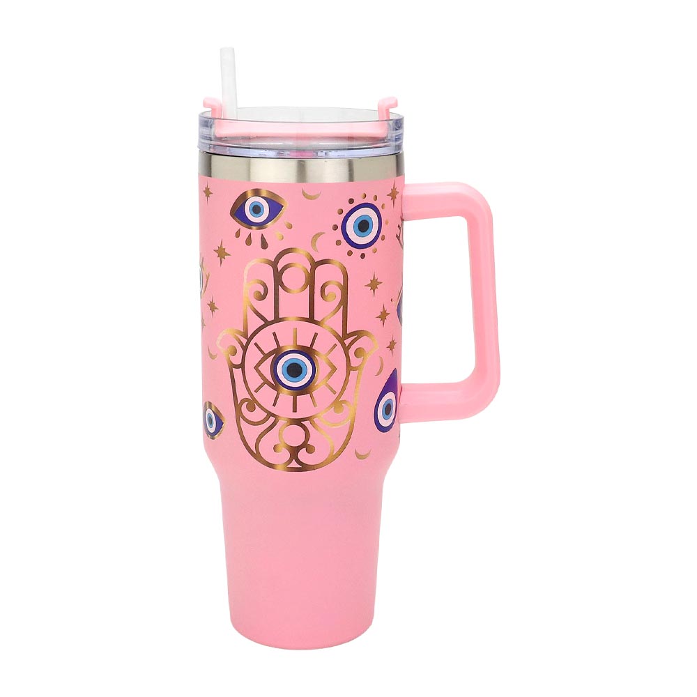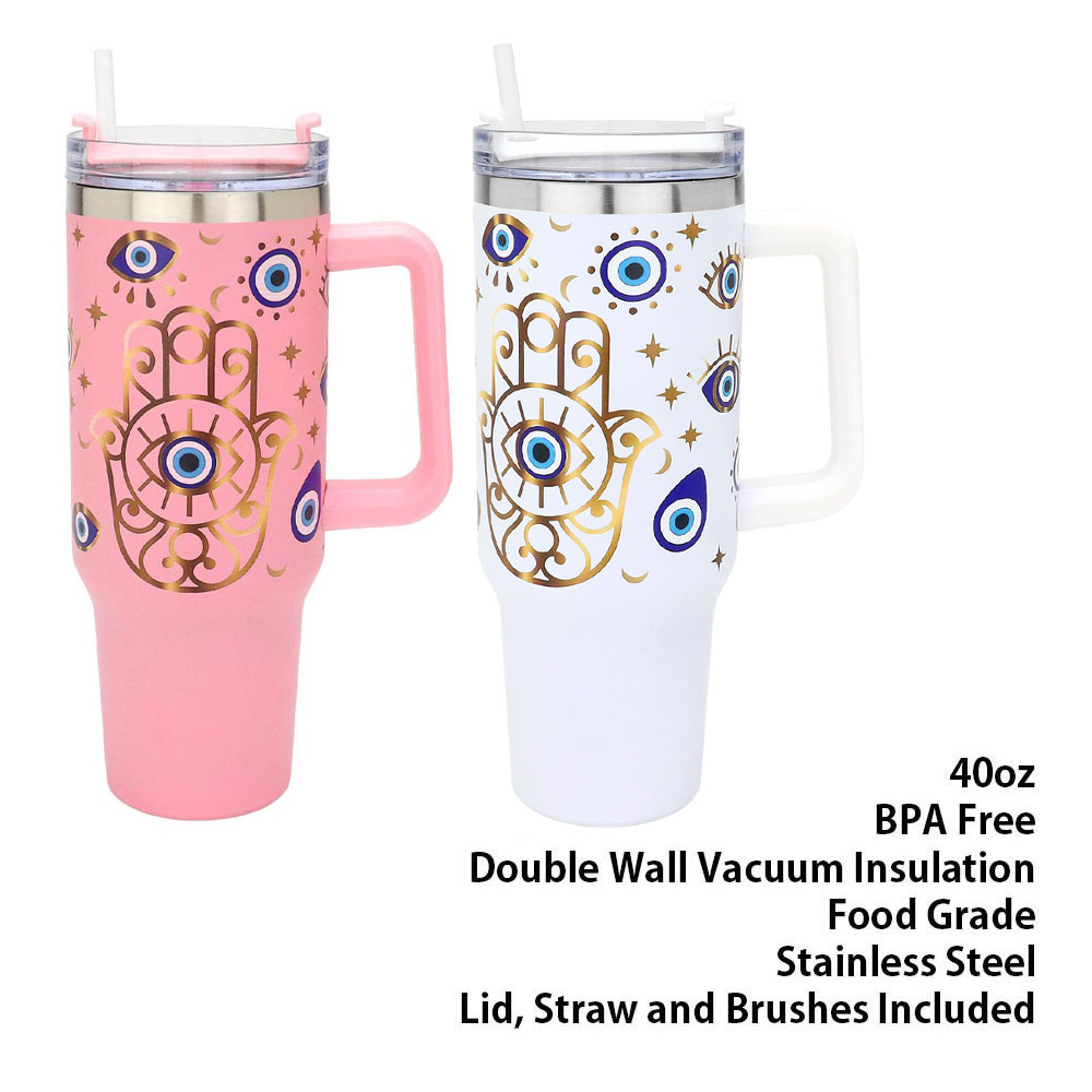 Details • 40oz Tumbler with Handle • BPA Free • Hot and Cold • Double Wall Vacuum Insulation • 1 Lid, 1 Straw and 2 Brushes Included • Bring good vibes on the go with this pink Hamsa Evil Eye travel tumbler. Featuring mystical protective designs, a sturdy handle, and straw lid, this 40oz tumbler keeps drinks hot or cold. A stylish, spiritual accessory perfect for everyday use or gifting with meaning and charm. • Stainless Steel