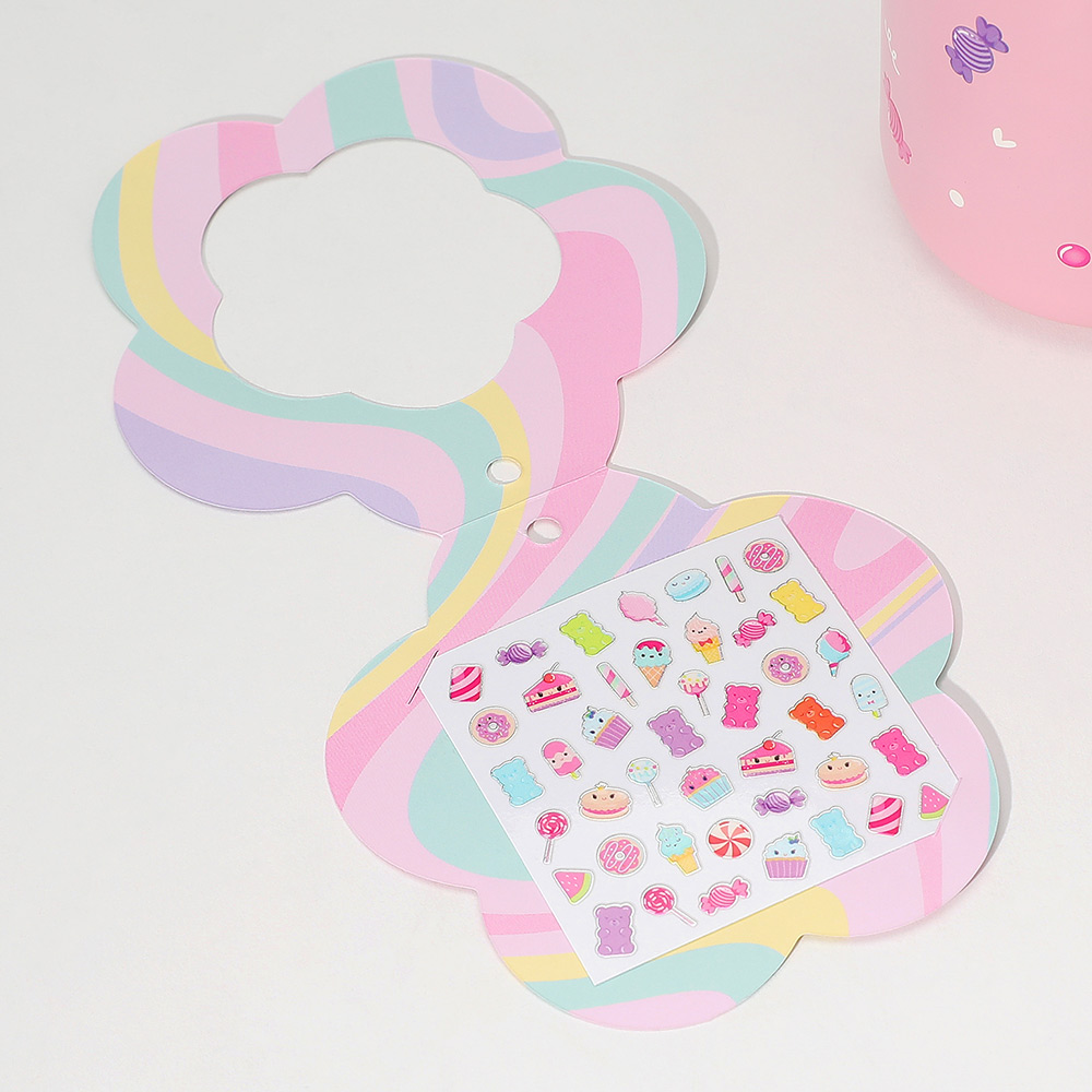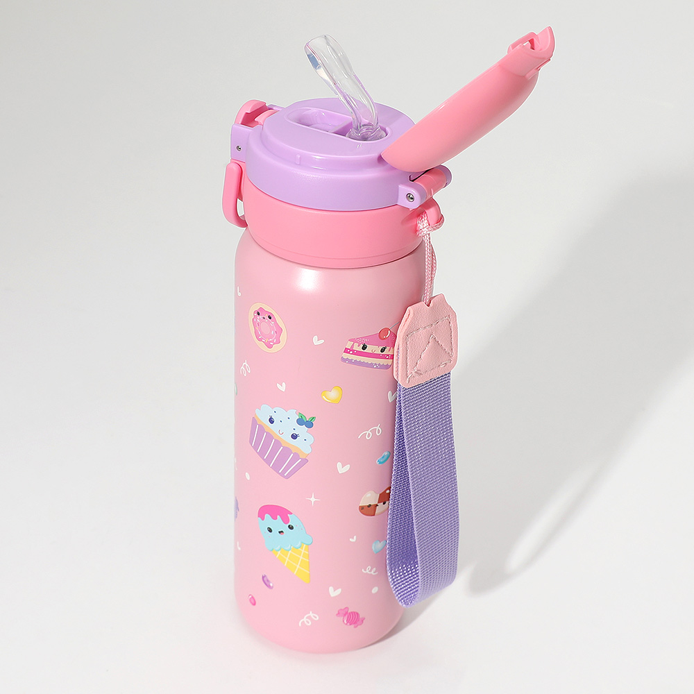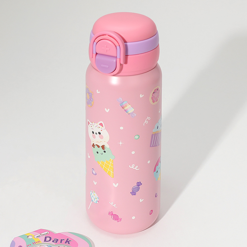 Details • Size : 2.5" X 9" (15.59fl.oz. / 550ml) • Sticker Size : 2.3" X 2.3" • Strap Size : 6.25" L • Pop Open • Easy Carry with Strap • BPA Free • Do not microwave • Not intended for hot liquids • Clean water bottle with dish soap and warm water before use • Hand wash only • 1 Double lid Stainless Steel Water Bottle, 1 Grow in the Dark Nail Sticker Included • Stainless Steel