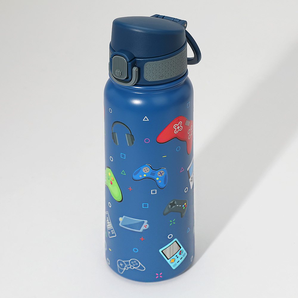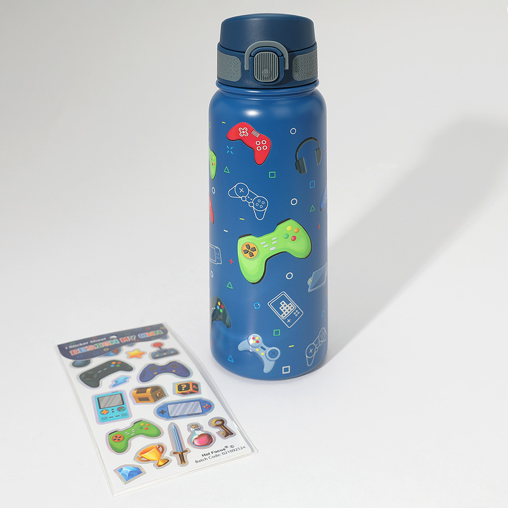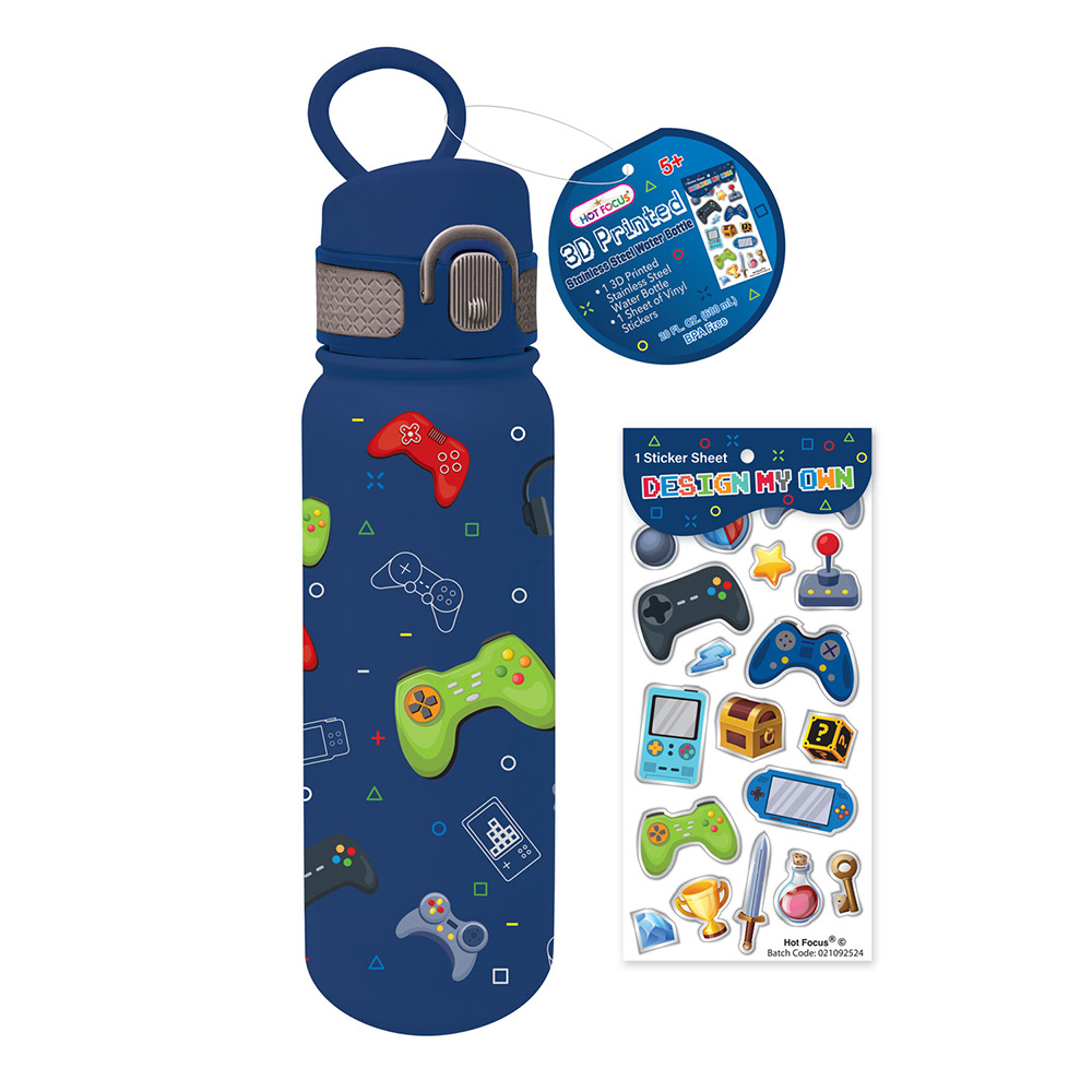 Details • Size : 2.8" X 9.5" (20fl.oz. / 600ml) • Sticker Size : 2.75" X 2.75" • Pop Open • BPA Free • Do not microwave • Not intended for hot liquids • Clean water bottle with dish soap and warm water before use • Hand wash only • 1 3D Printed Stainless Steel Water Bottle, 1 Sheet of vinyl Stickers Included
