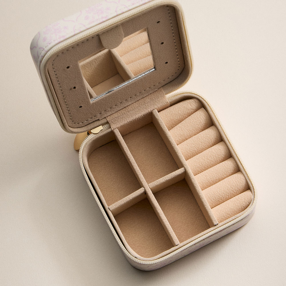 • Keep your favorite jewelry organized and protected on the go with this compact travel case featuring multiple divided compartments, secure ring slots, and a built-in mirror for quick accessorizing. The elegant floral pattern adds a stylish touch, while the zip closure ensures pieces stay safe. Perfect for trips, daily storage, or gifting to jewelry lovers.