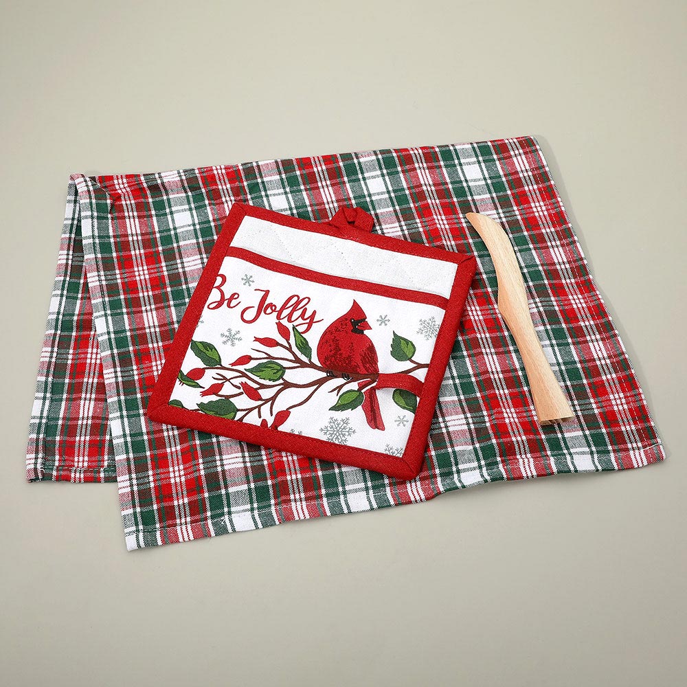 3PCS - Holiday Plaid Kitchen Towel BE JOLLY Message Cardinal Potholder Wooden Spreader Set