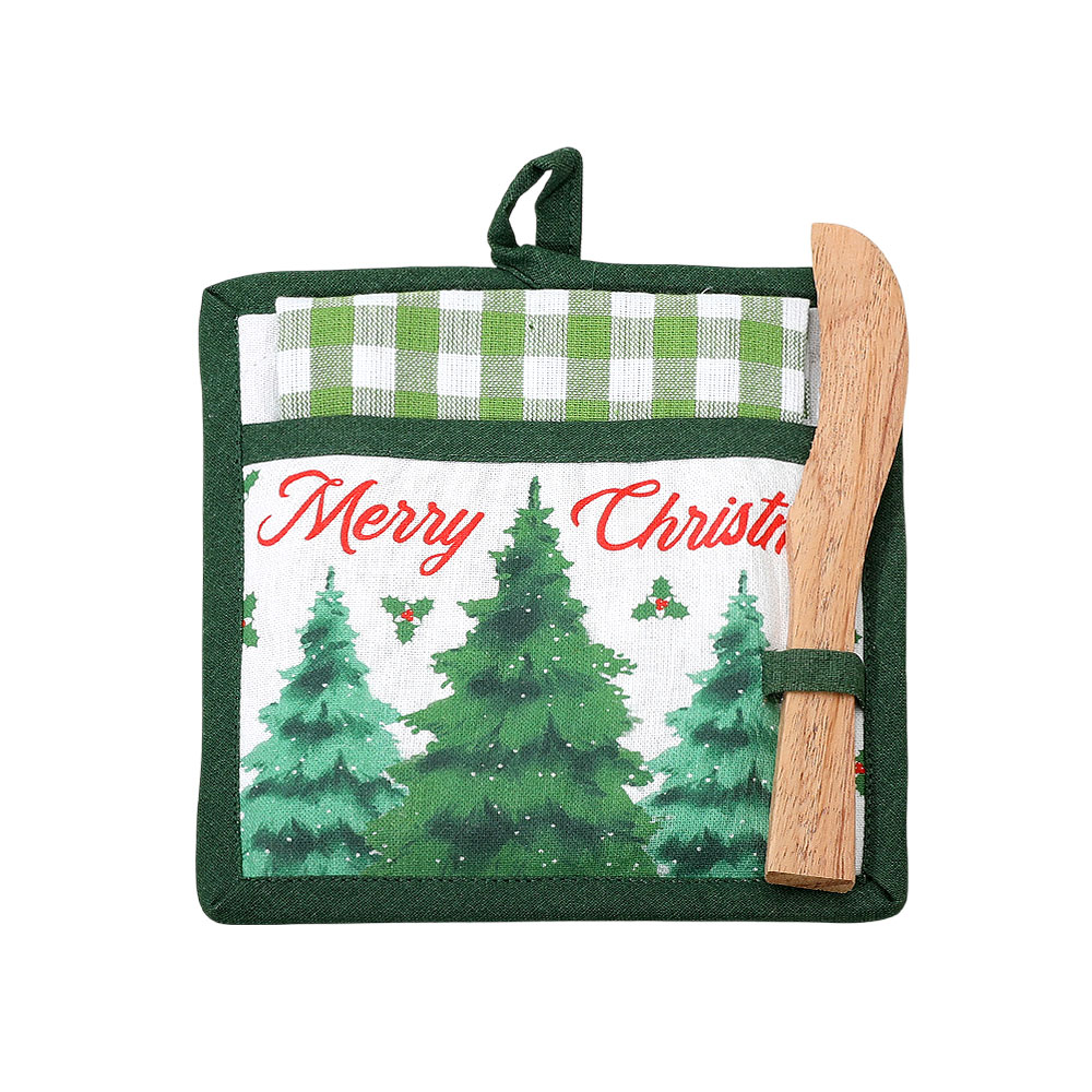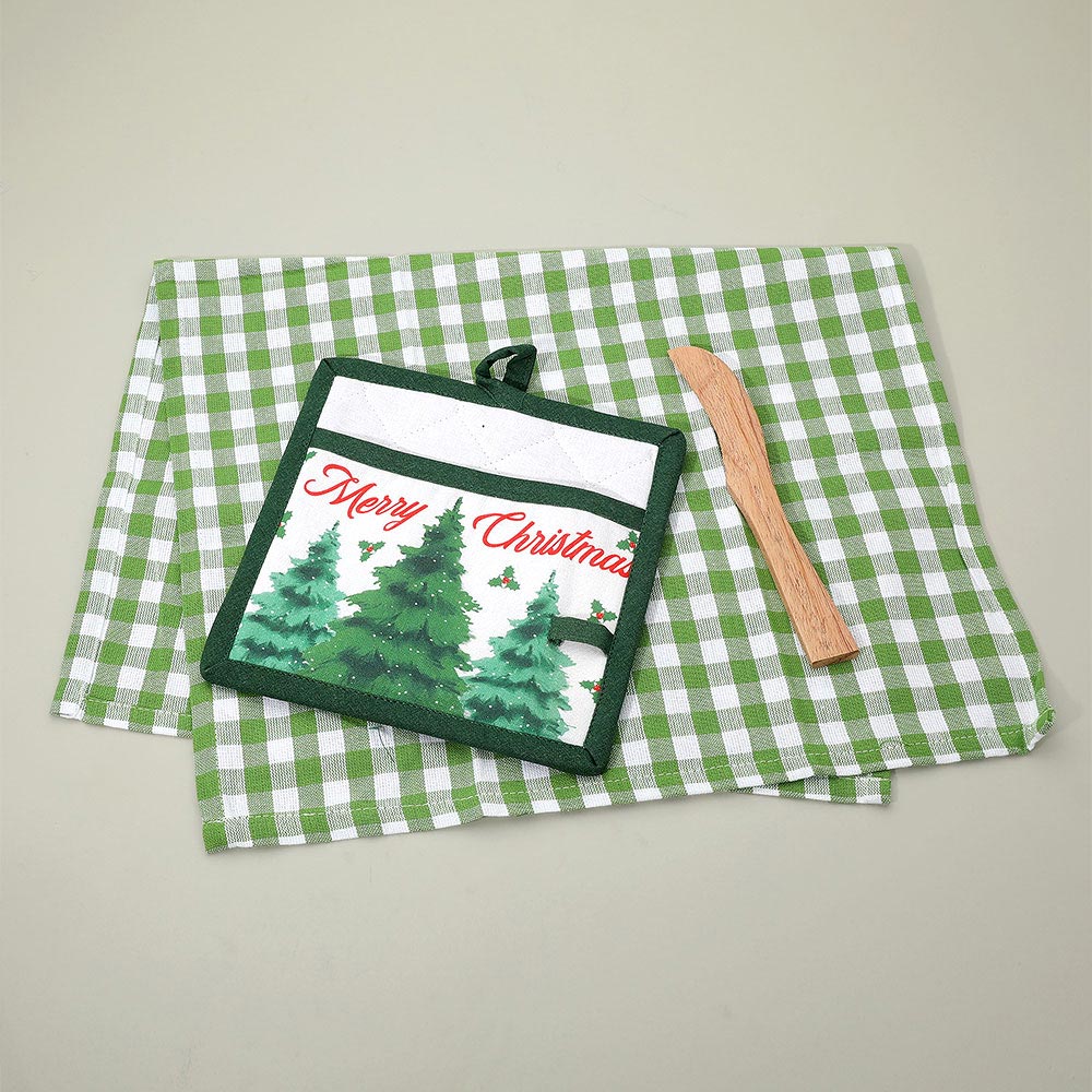 3PCS - Holiday Plaid Kitchen Towel Christmas Trees Potholder Wooden Spreader Set
