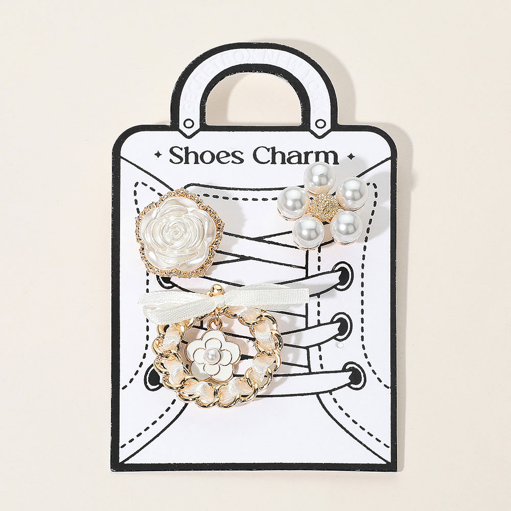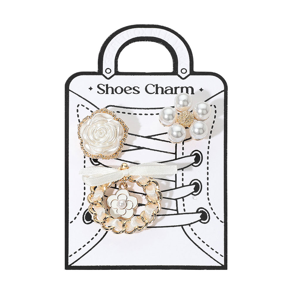 Details • Size : 0.75" L - 1.25" L • Refined shoes charm set featuring pearl accents, rose embellishments, and a floral ring design. A perfect accessory to personalize your footwear with a touch of elegance.
