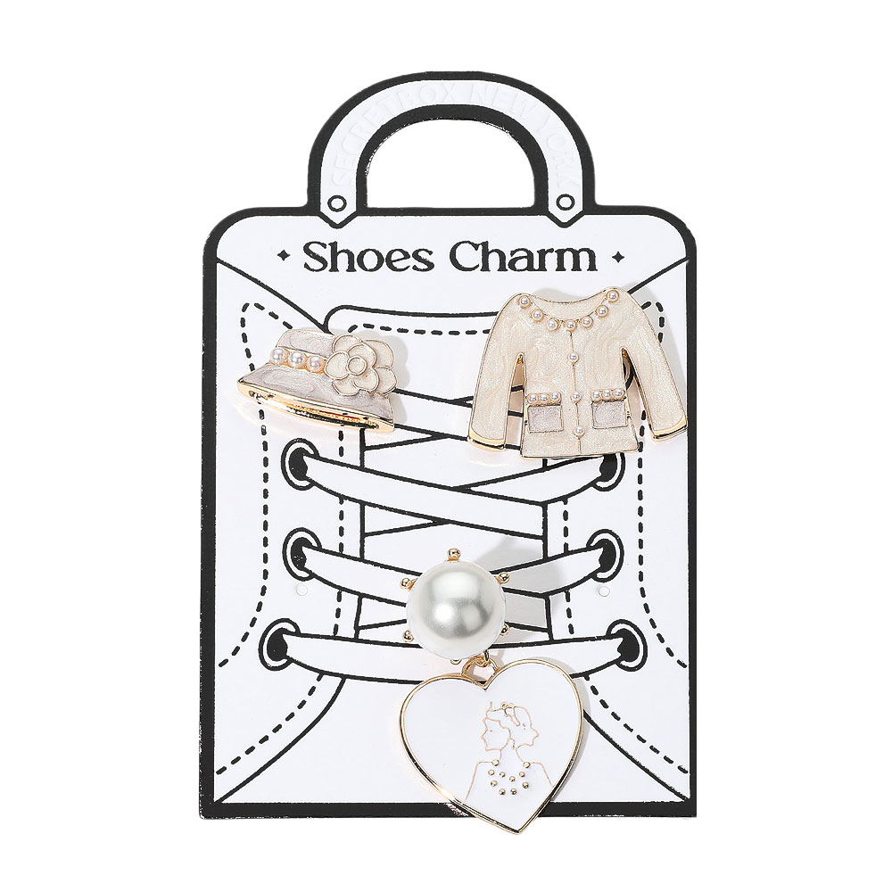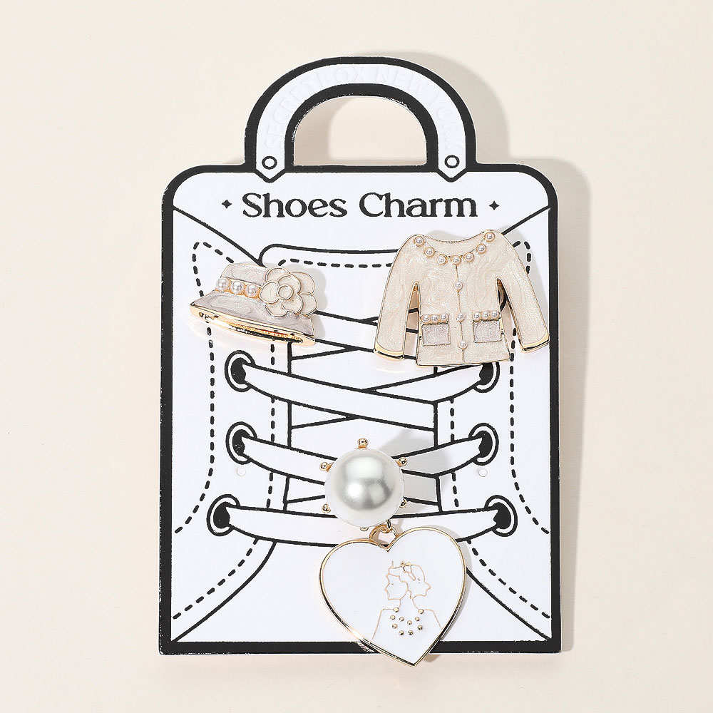 Details • Size : 0.6" L - 1.75" L • Stylish shoes charm set featuring a mini sweater, floral hat, pearl drop, and engraved heart charm. Elevate your footwear with these elegant and fashion-inspired accessories.