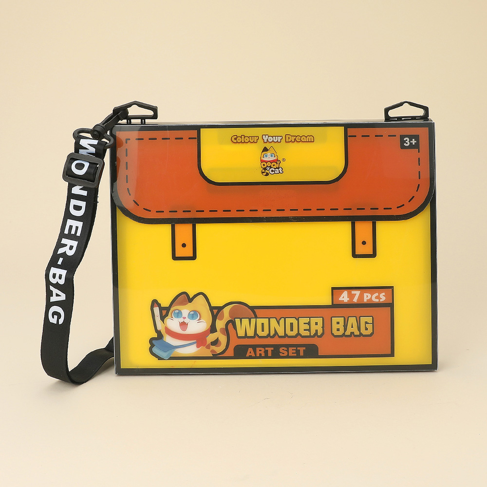 Details • Size : 10.25" X 8" X 12" • Strap Size : 47" L / Adjustable, Detachable • 6 Washable Markers, 6 Color Pencil Crayons, 1 Coloring Comic Book, 1 Eraser, 1 Sharpener, 1 Brush, 1 HB Pencil, 1 Palette, 8 Watercolor, 15 Stickers and 6 Color Pencils Included • Inspire creativity with this 47-piece kids art set featuring pencils, markers, paints, crayons, and more. Packed in a fun, easy-to-carry shoulder bag, it’s perfect for school projects, travel, or at-home art fun—designed to make every creative moment colorful and imaginative.