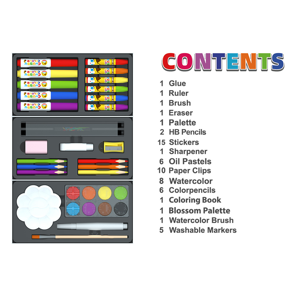 Details • Size : 10" X 5" • Top Handle Size : 1.5" L • 1 Ruler, 1 Brush, 1 Eraser, 1 Palette, 15 Stickers, 2 HB Pencils, 1 Blossom Palette, 1 Watercolor Brush, 5 Washable Markers, 1 Coloring Book, 8 Watercolor, 1 Sharpener, 6 Oil Pastels, 6 Color Pencils, 10 Paper Clips Included • Exciting 61-piece art truck set featuring markers, pencils, watercolors, stickers, and more in a fun rolling truck case. Complete with drawers for easy storage, this portable art kit encourages creativity and imagination, making it a perfect gift for young artists and craft enthusiasts.