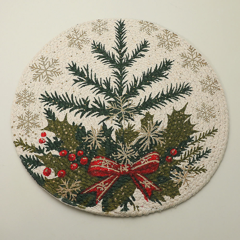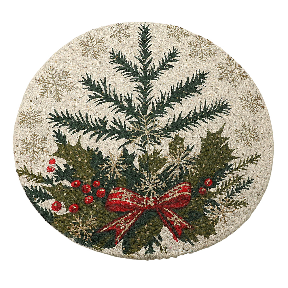 • Set a festive holiday table with this 14-inch round placemat featuring a decorated Christmas tree design with holly, berries, golden snowflakes, and a red bow accent. Ideal for Christmas dining and seasonal dĂ©cor.