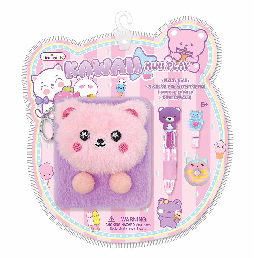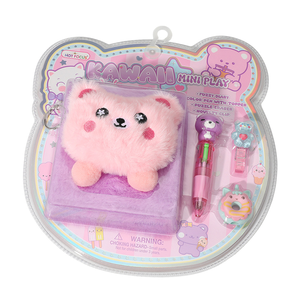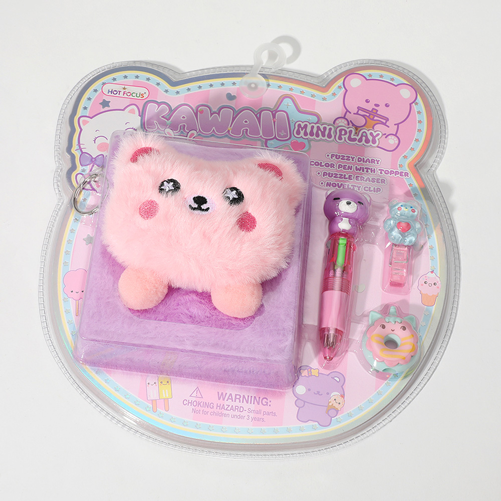 Details • Diary Size : 4.25" X 4.75" • Pen Size : 3.8" L • Clip Size : 1.8" L • Eraser Size : 1.5" L • 1 Fuzzy Diary, 4 in 1 Color Pen with Topper, 1 Novelty Clip and 1 Puzzle Eraser Included