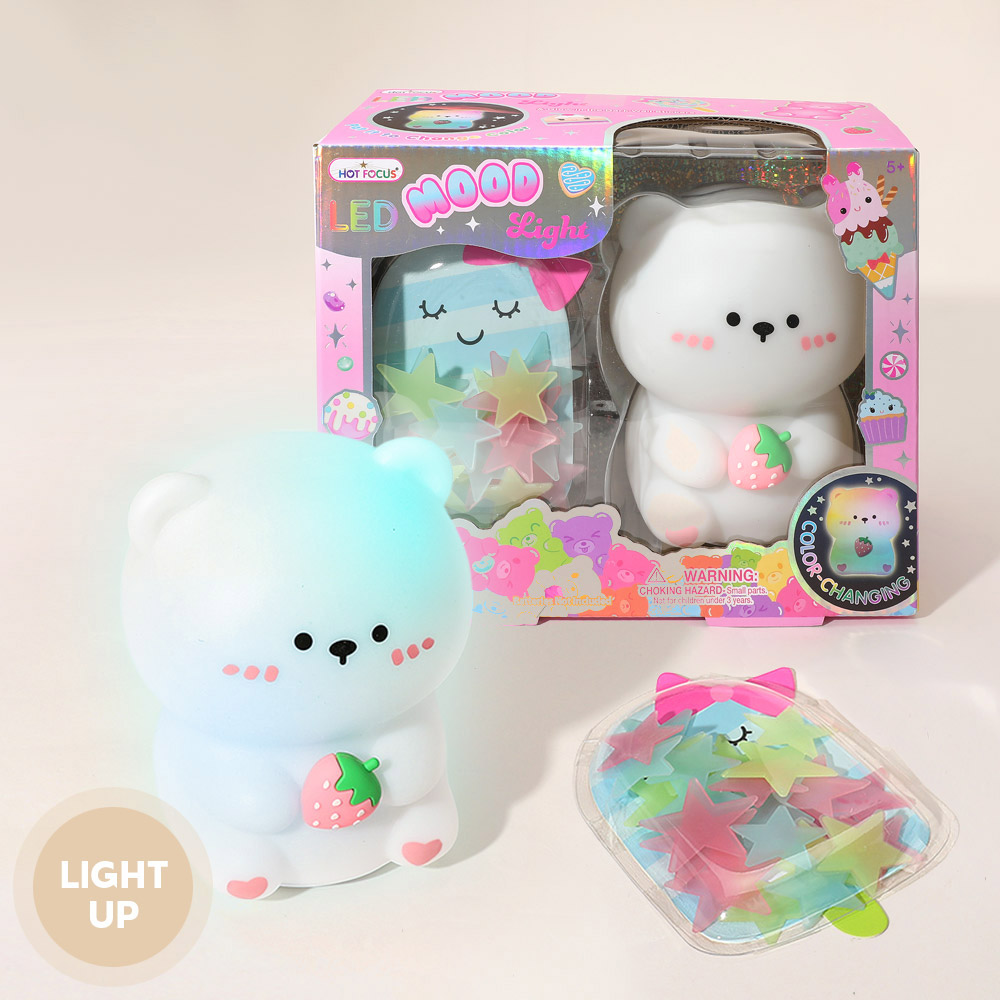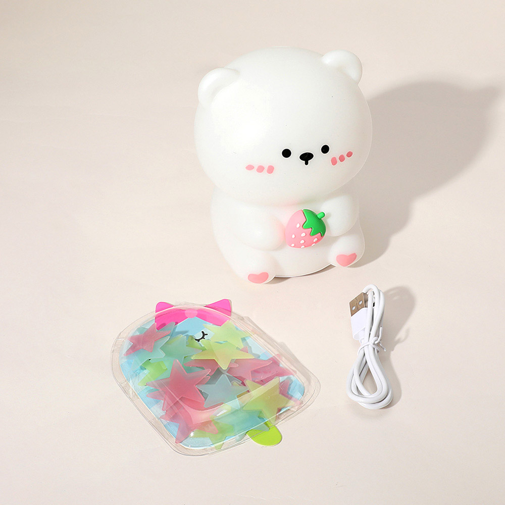 Details • Lamp Size : 4.5" X 5.25" • Glow in the Dark Star Sticker Size : 1.25" X 1.25" (25PCS) • 7 Colors : Including Gradient Mode and Flashing Mode • Tap to Change Colors • BPA Free Soft Silicone Material • Operated by Batteries or USB-C Charging Cable • Pat Design / Multimode / Safe Silicon / Eye Care / Decor and Gift • 1 LED Mood Light, 1 USB Charging Cable and 25 Glow in the Dark Wall Stickers Included