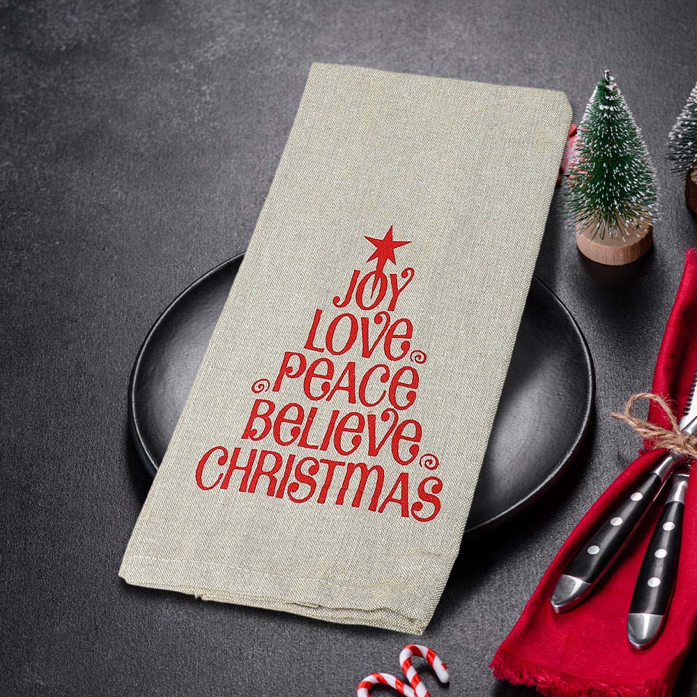 JOY LOVE PEACE BELIVE Christmas Message Printed Holiday Kitchen Towel