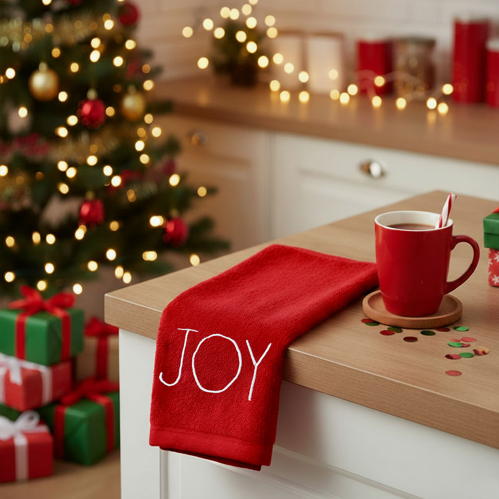 • Celebrate the season with this festive kitchen towel featuring an uplifting embroidered message design. Perfect for holiday kitchens, seasonal dĂ©cor, baking days, and gifting, it adds charm, warmth, and inspiration to your celebrations.