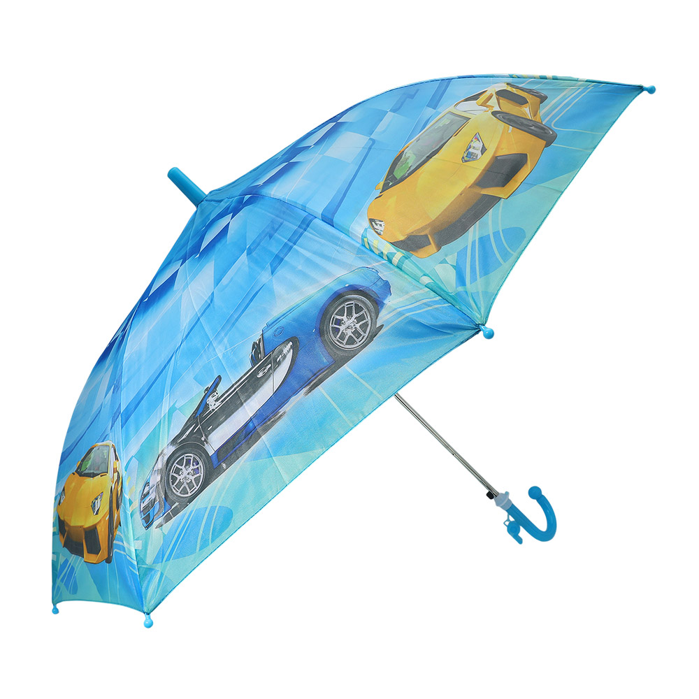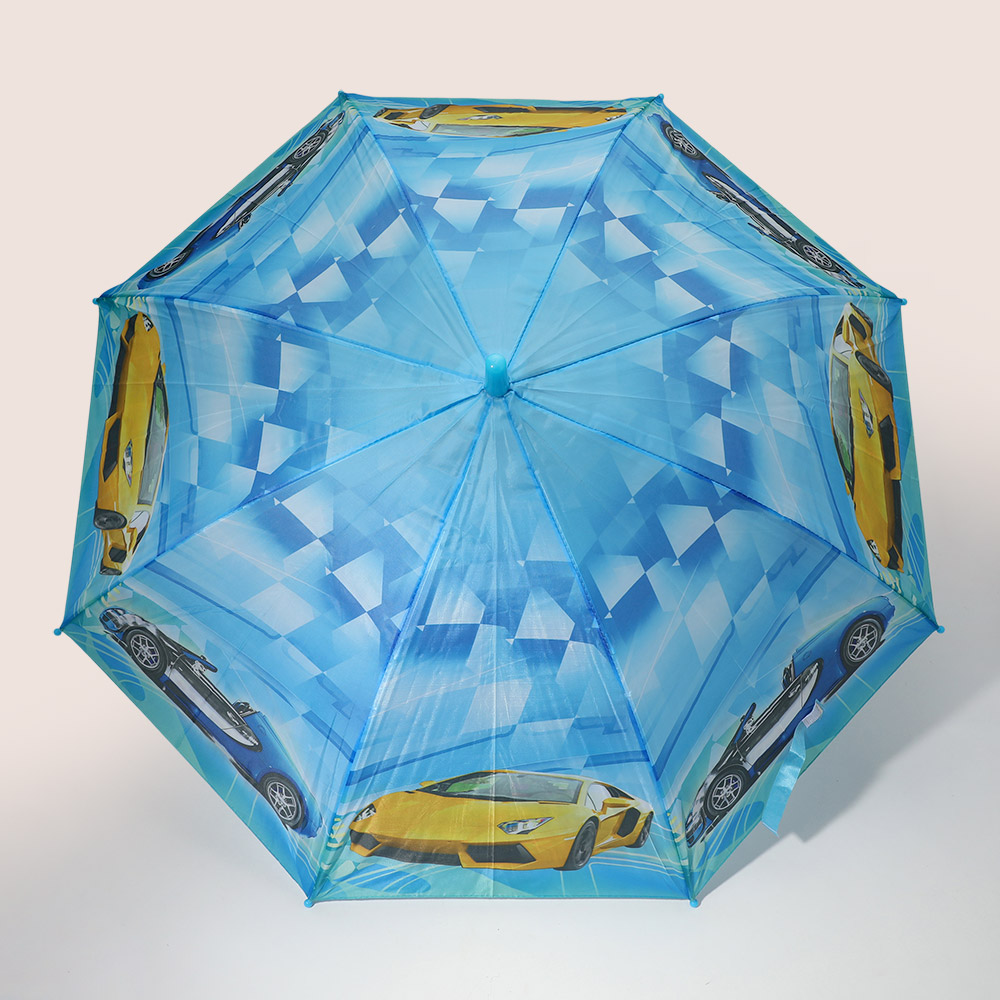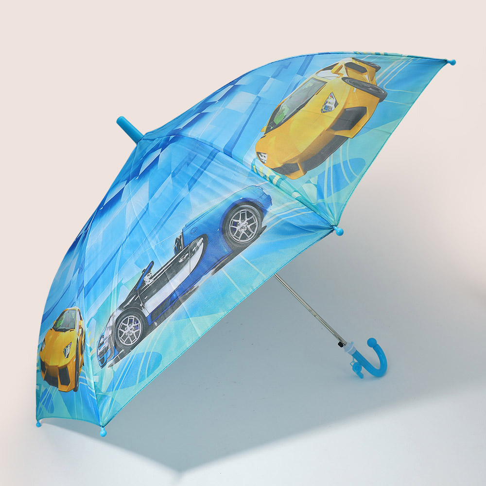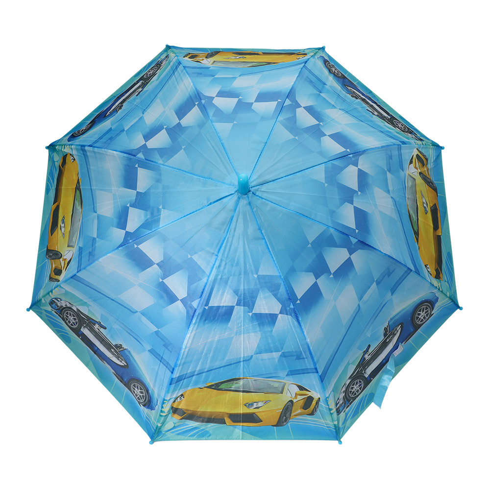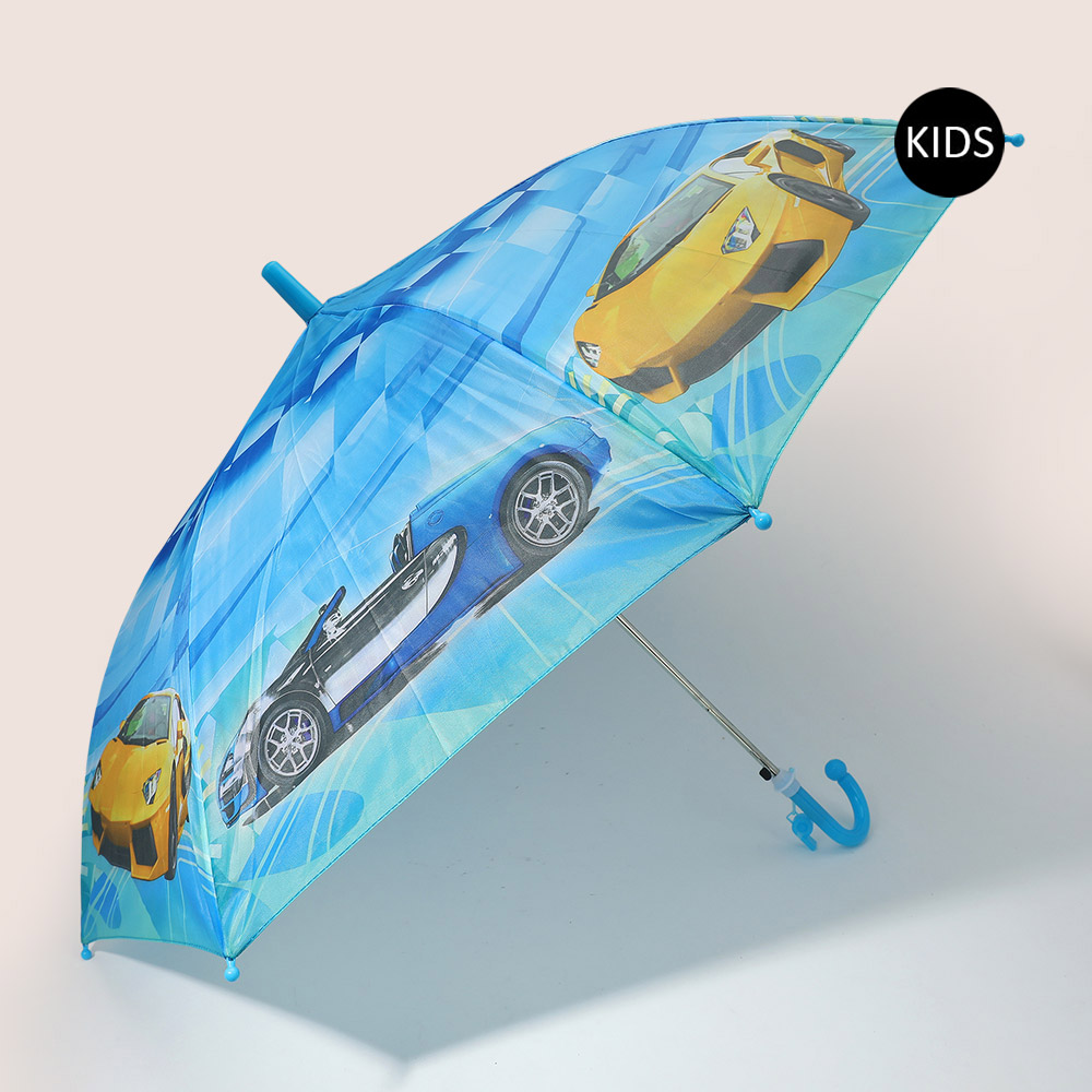 • Exciting kids umbrella featuring a bold sports car print with geometric pattern. Lightweight dome-shaped canopy and secure tips provide comfortable rain protection for school days or outdoor fun.