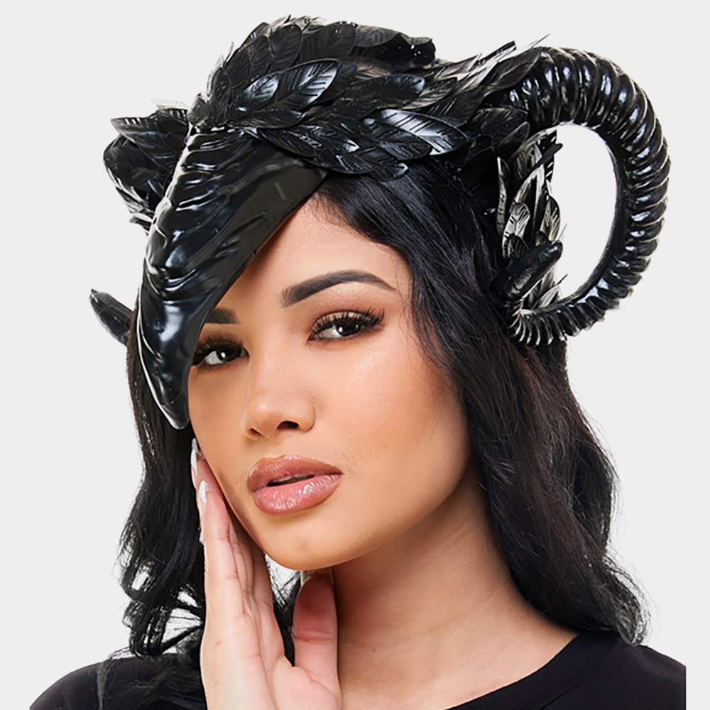 • Command attention with this dramatic horned headpiece adorned with glossy feathers and textured elements. Perfect for fantasy, cosplay, or costume events, this bold accessory adds mystical flair to any ensemble. Ideal for standout looks and themed occasions.