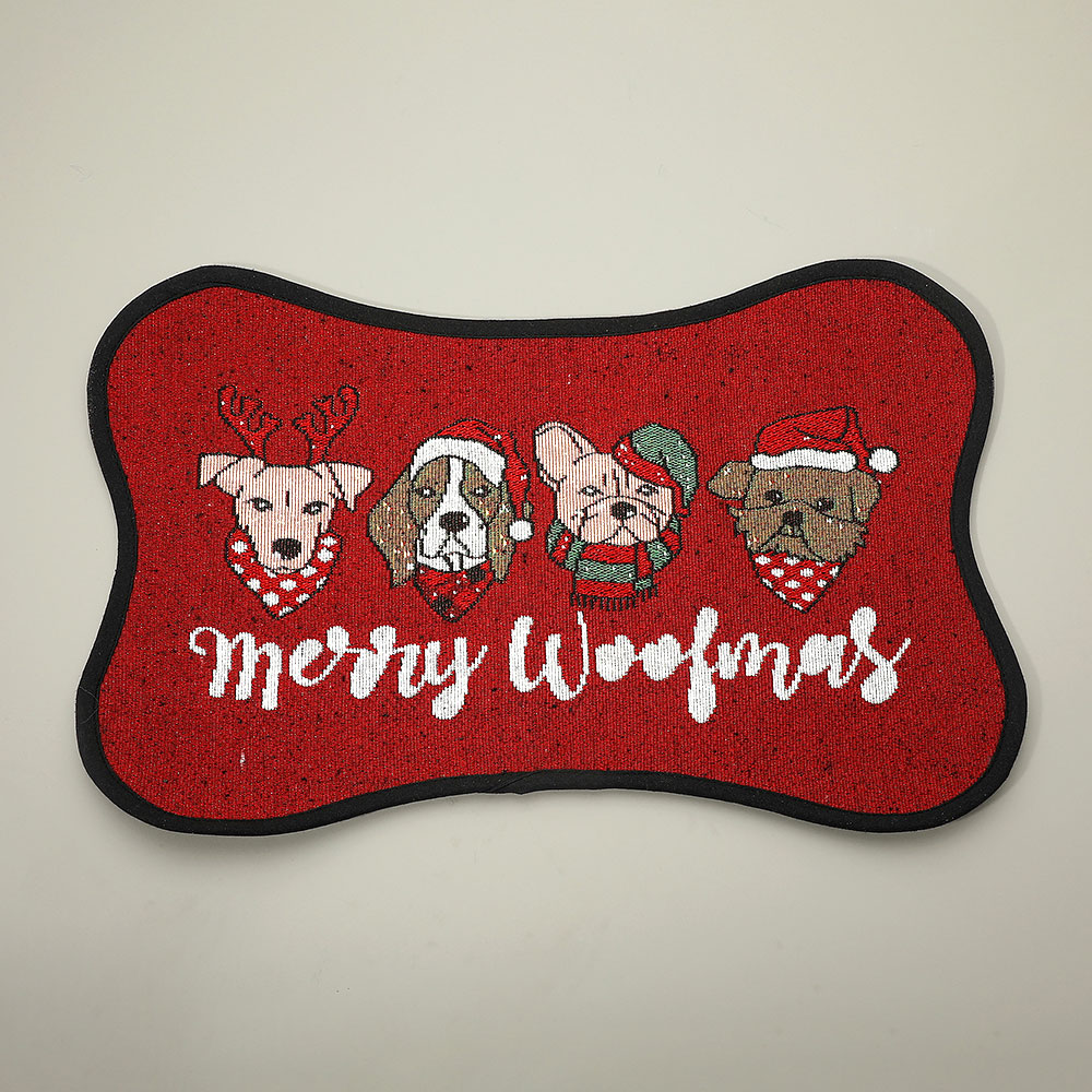 • Celebrate the holidays with this festive bone-shaped pet bowl mat featuring adorable dogs in seasonal outfits and a “Merry Woofmas” message. Perfect for keeping your pet’s feeding area tidy while adding holiday charm and playful style to your dĂ©cor.