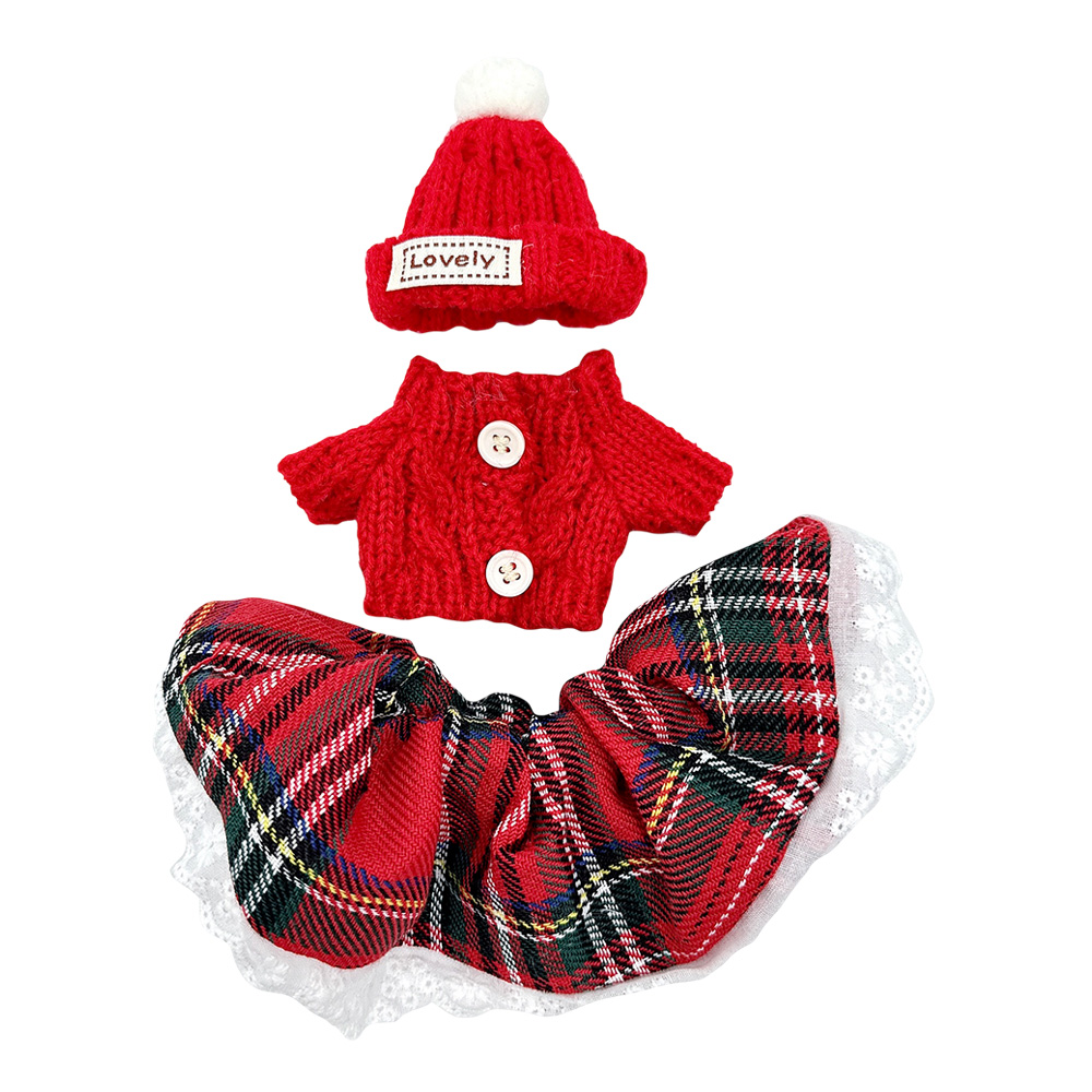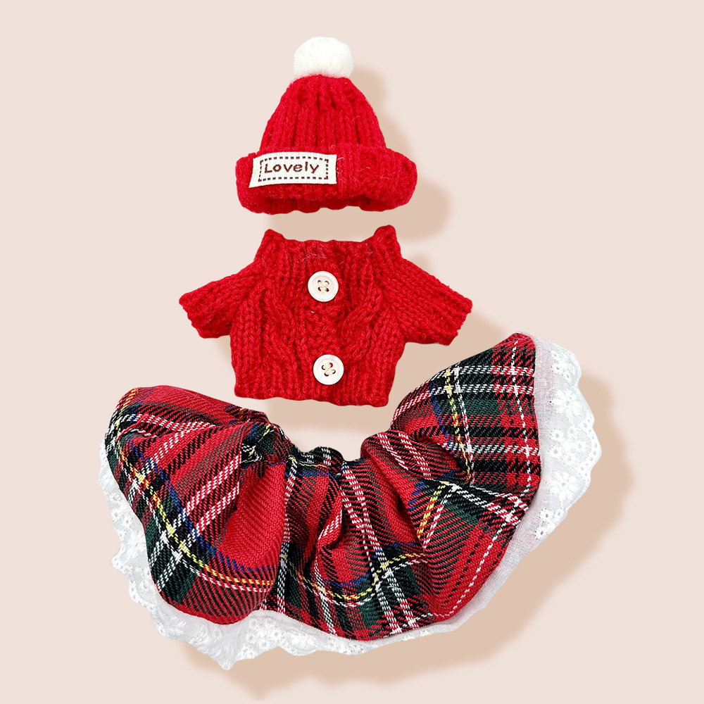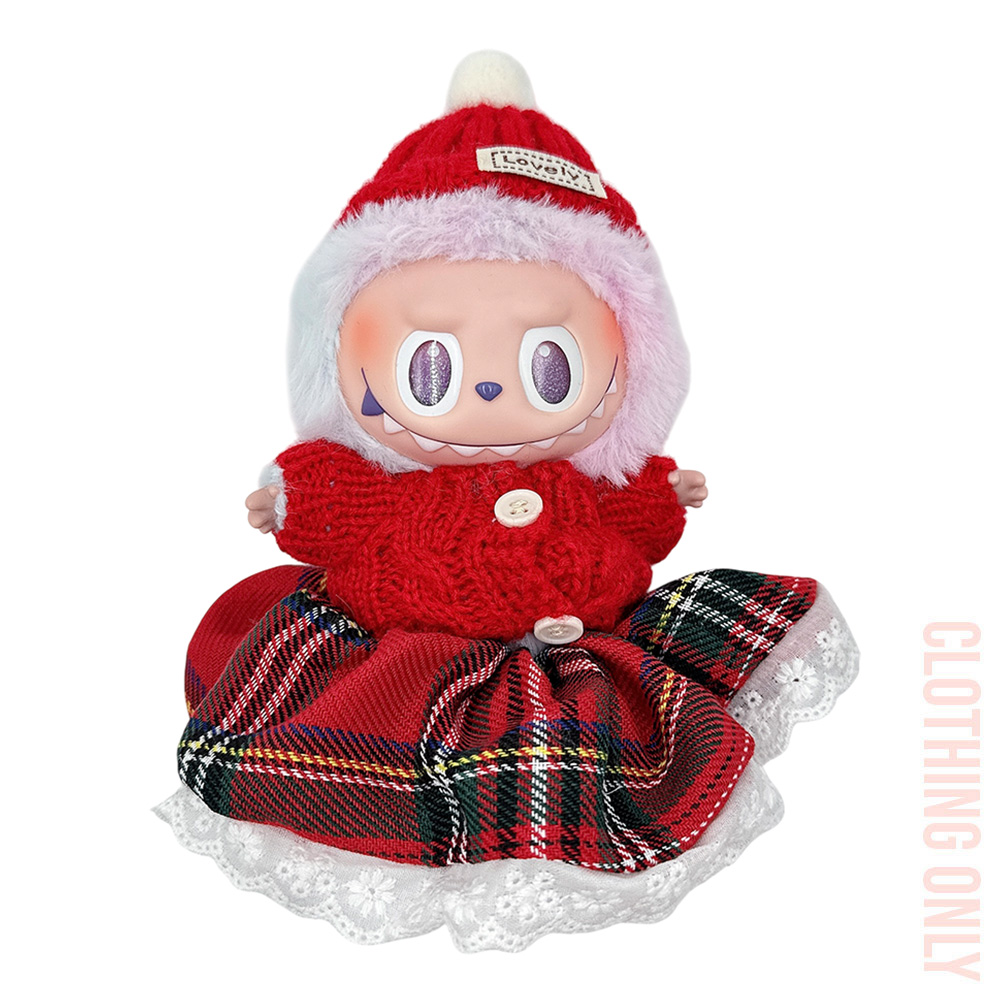 Details • Size : One Size • Material : 100% Polyester • Labubu Doll Compatible • Doll NOT Included • Charming doll clothing set featuring a cozy knit hat with pom pom, buttoned knit top, and plaid skirt trimmed with lace. Ideal for festive dress-up, gifting, or adding seasonal flair, this outfit brings style and warmth to any doll’s wardrobe collection.