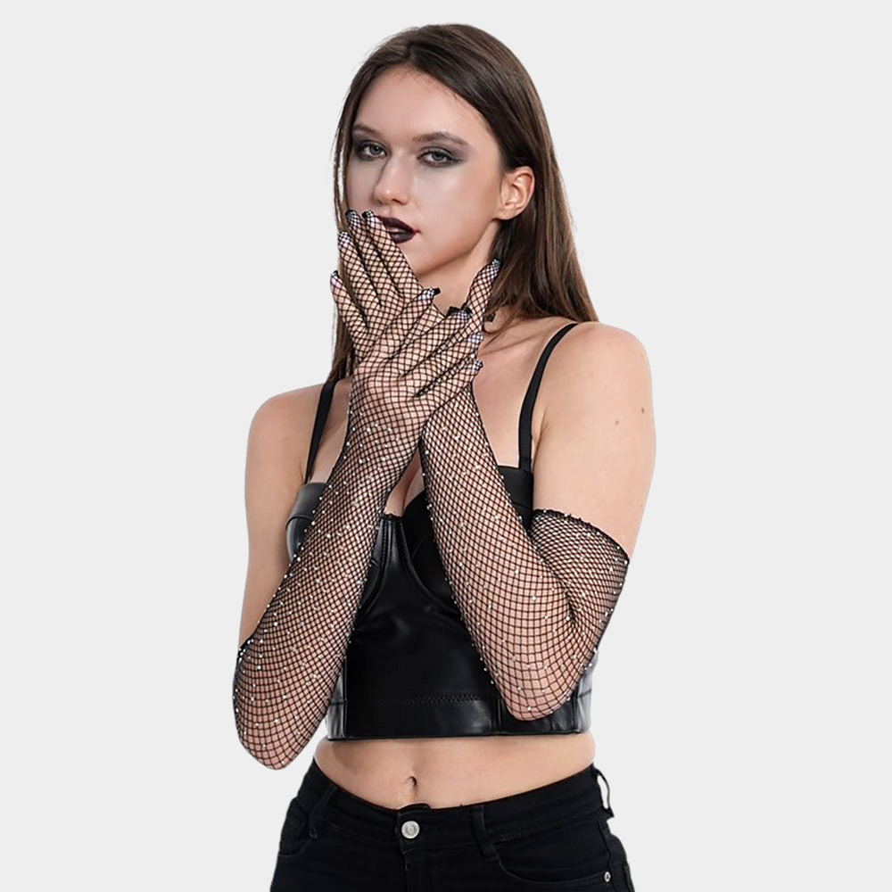 • Elevate your edgy style with these black fishnet opera gloves adorned with shimmering rhinestones. Perfect for gothic fashion, parties, cosplay, or clubwear, these long mesh gloves add a daring touch to any outfit. Crafted from stretchy, breathable material for a comfortable one-size fit. A bold statement accessory for any occasion.