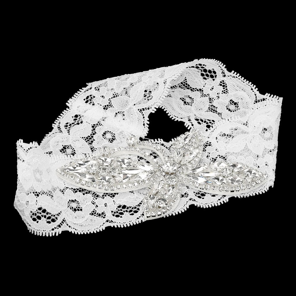 Details • Size : 2" H • Stretchable • The garter itself is made of intricate white lace and features a sparkling embellishment of clear crystals or rhinestones arranged in a decorative pattern. The lace has a scalloped edge, adding to its feminine and elegant look.