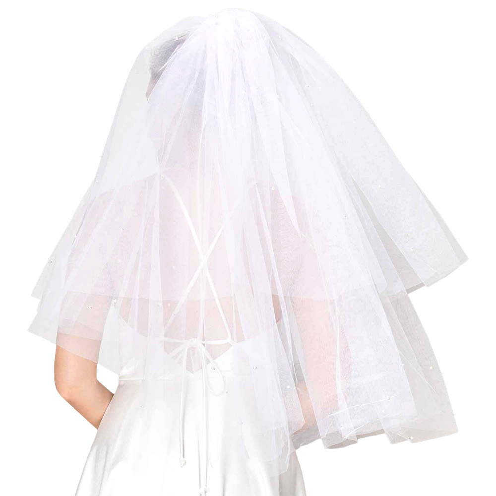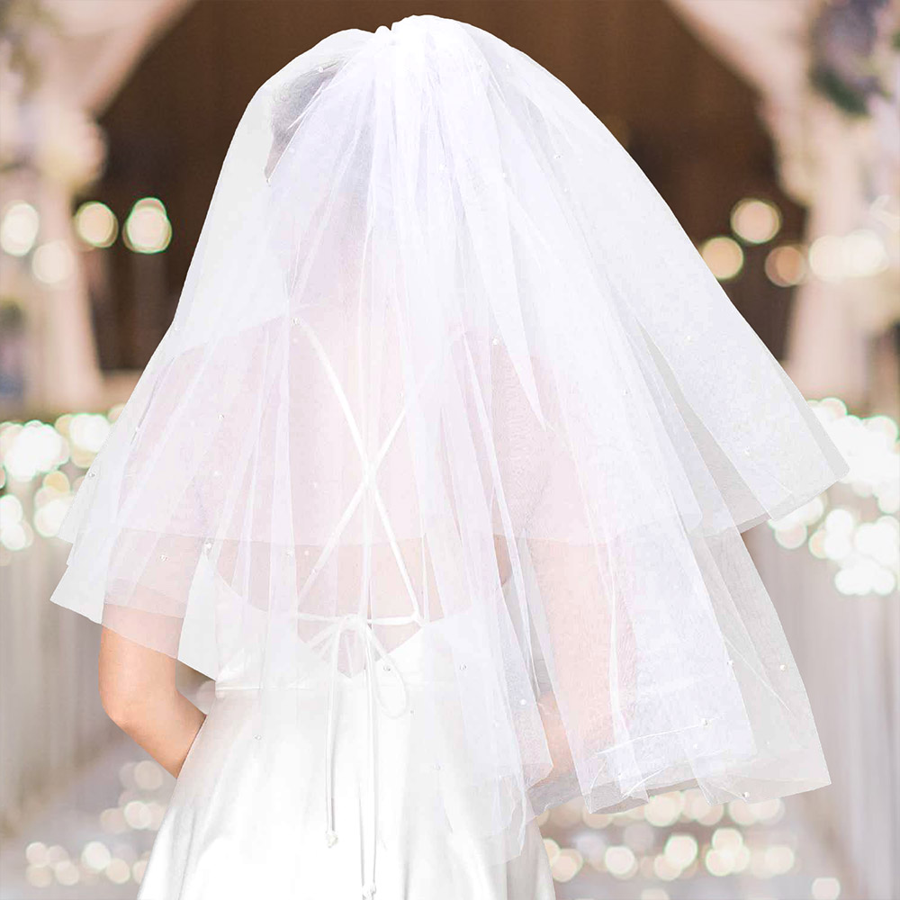 Details • Length : 32" L • This graceful two-tier bridal veil is adorned with soft pearls, adding a touch of elegance to your wedding day look. With two layers of delicate tulle, this veil provides a beautiful flow and enhances the bride’s gown. Perfect for a classic, romantic bridal style.