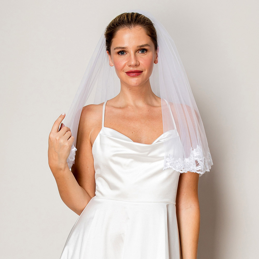 • This exquisite two-tier bridal veil features delicate lace trim, adding a romantic touch to your wedding day look. The soft tulle layers cascade gracefully, offering a timeless and elegant addition to your gown.